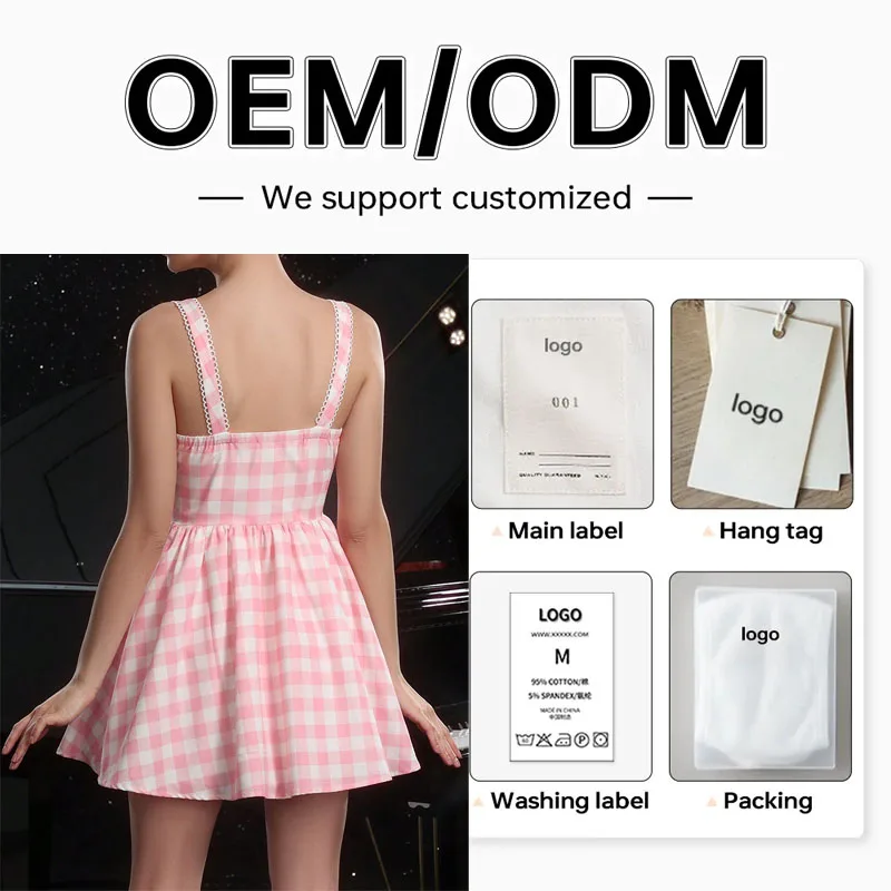New Fashion Design High Quality Pink Plaid Lace Trim Clothes Women Casual Summer Mini Dresses