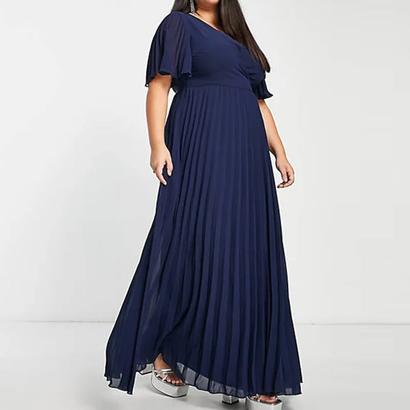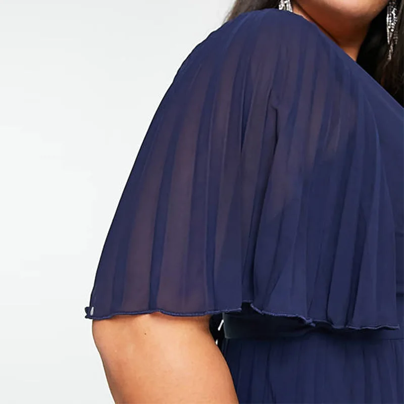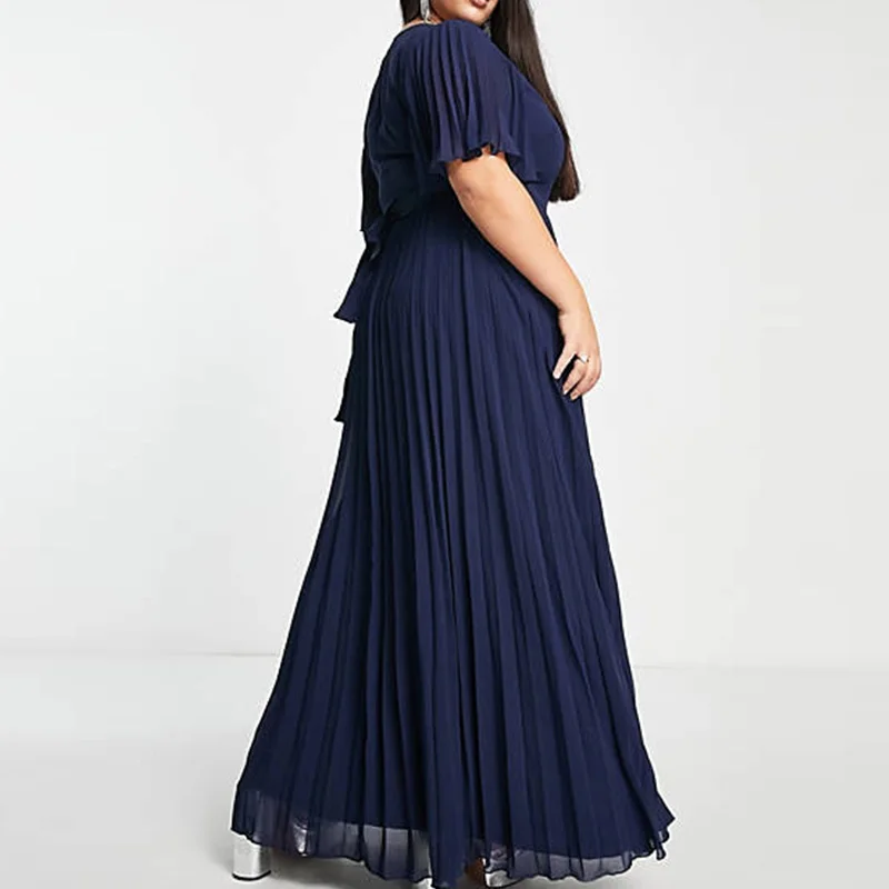 New Formal Plus Size Women's V-neck Flutter Sleeve and Tie-back Waist Pleat Navy Elegant Maxi Dress