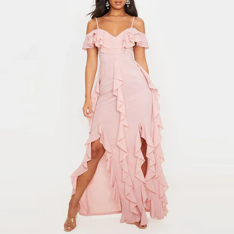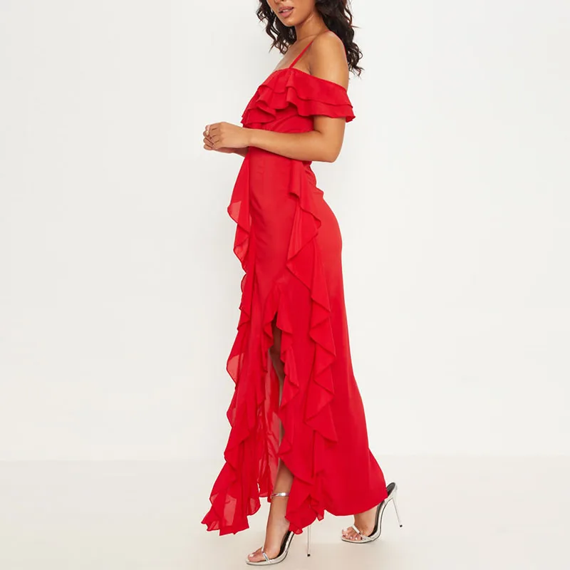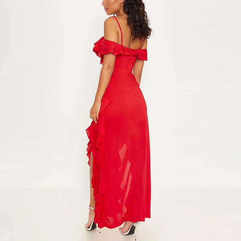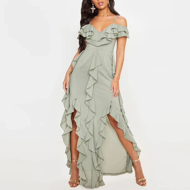 Solid Elegant Chiffon Dress Cold Shoulder Casual Petite Ruffle Slit Sexy Maxi Breathable Dress