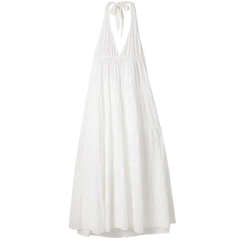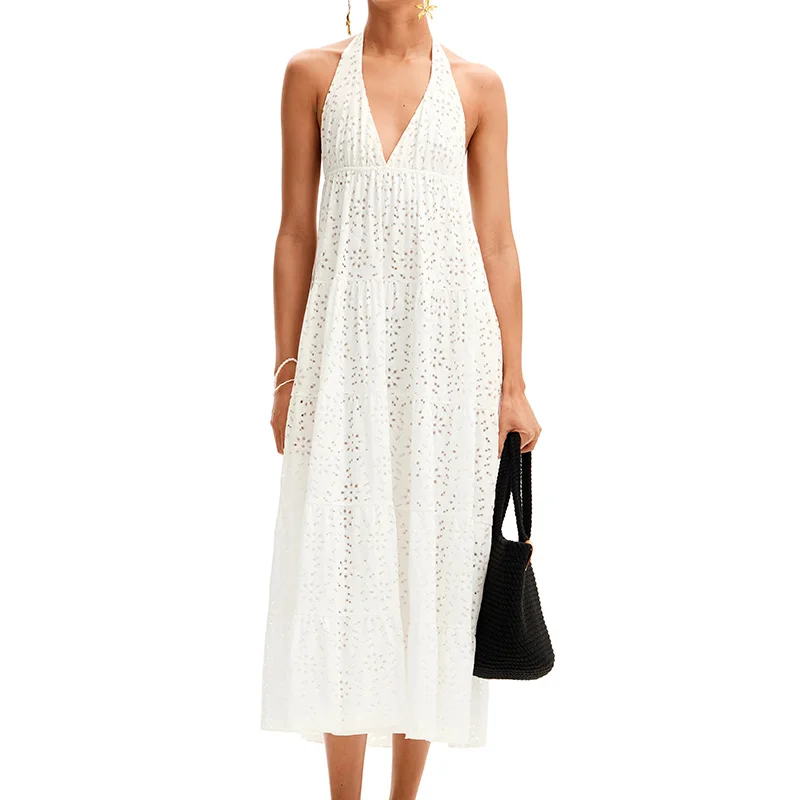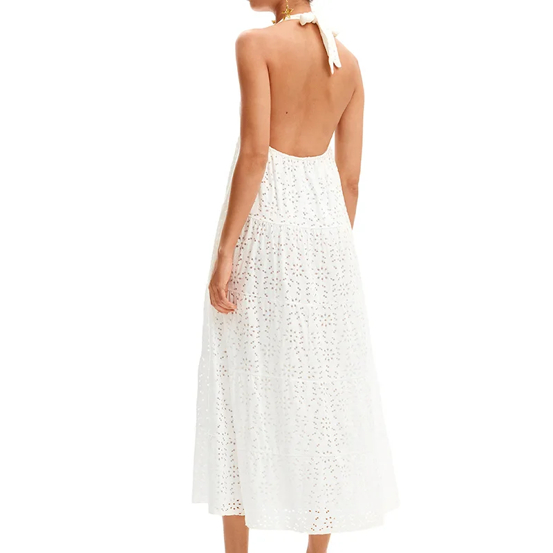 Holiday Style Dainty Eyelet Maxi Dress With Solid Long Plunging Halter A-line Women's Dresses