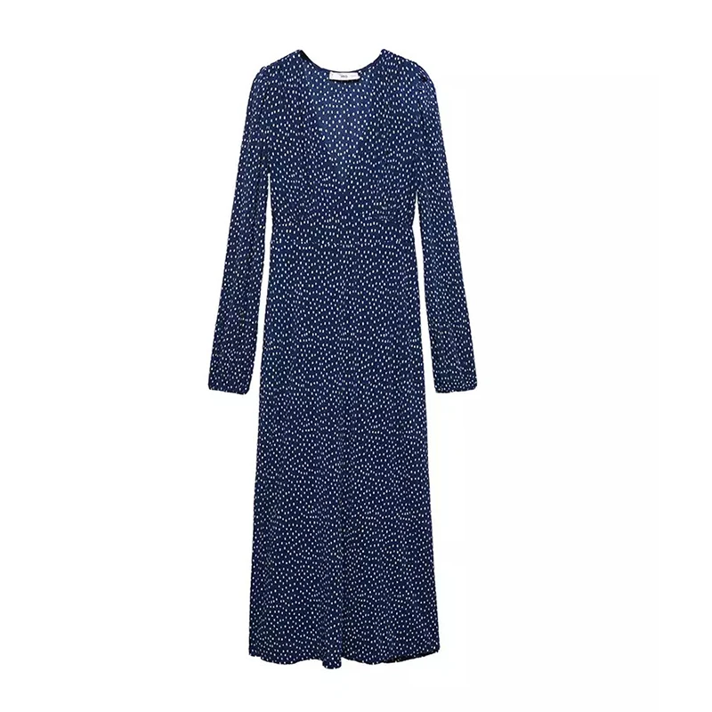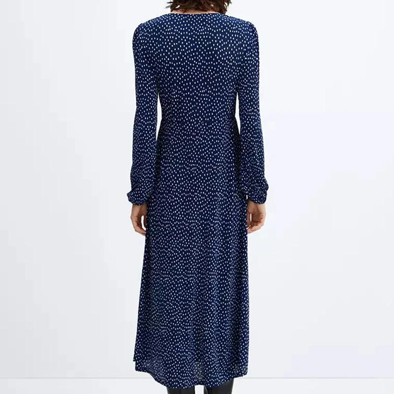 Lady Casual Style Long Sleeve Midi Dress With Vintage Polka Dot Printed Textured Custom Designed Clothing Long Dress Women