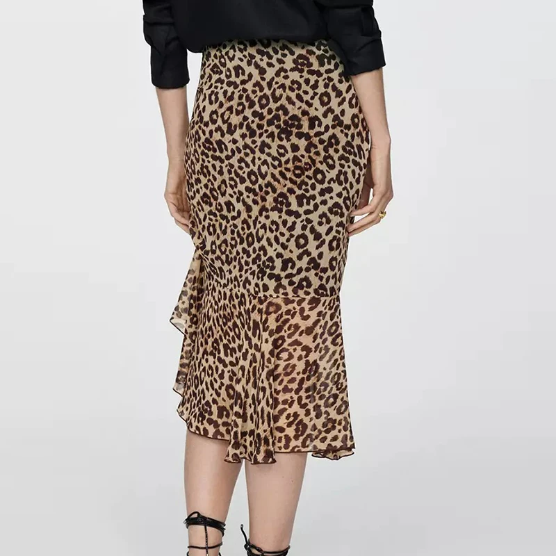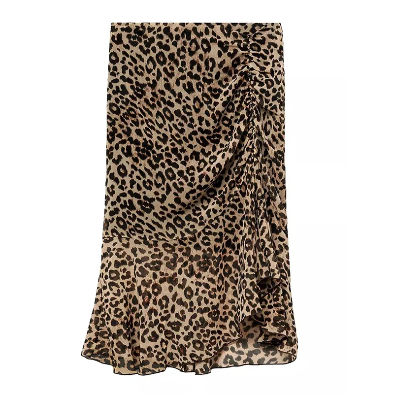 Bohemian Design Simple Sexy A-line Ruch Hem Vintage Leopard Side Gathered Chiffon Midi Skirt for Women