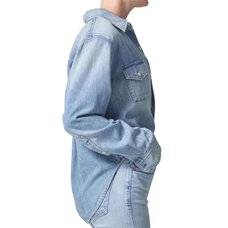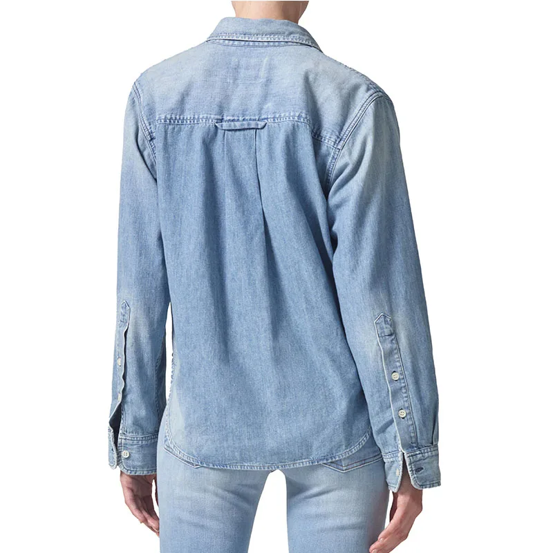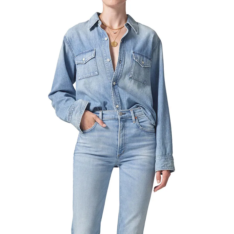 Classic Denim Lady Clothes Spread Collar Long Sleeves Chest Pocket Autumn Shirt Casual Clothes Light Denim Blouse Women