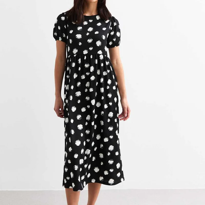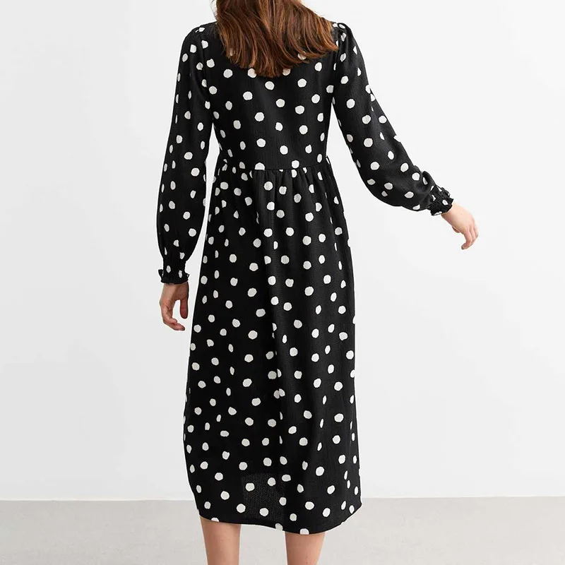 Autumn Modest Style Women's Long Sleeve and Elasticated Cuffs Slim Black Spotted Midi Smock Dress