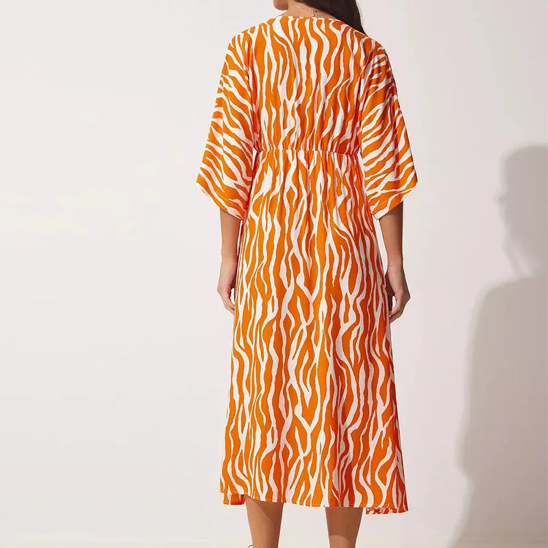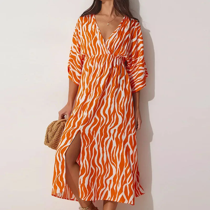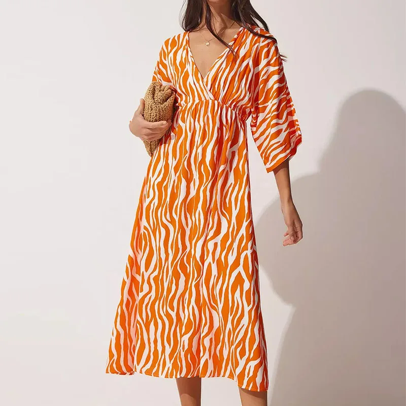 Lady Fashion Dress Deep V-Neck Summer Tropical Stripe Print Long Viscose Clothing Slim Women's Dresses