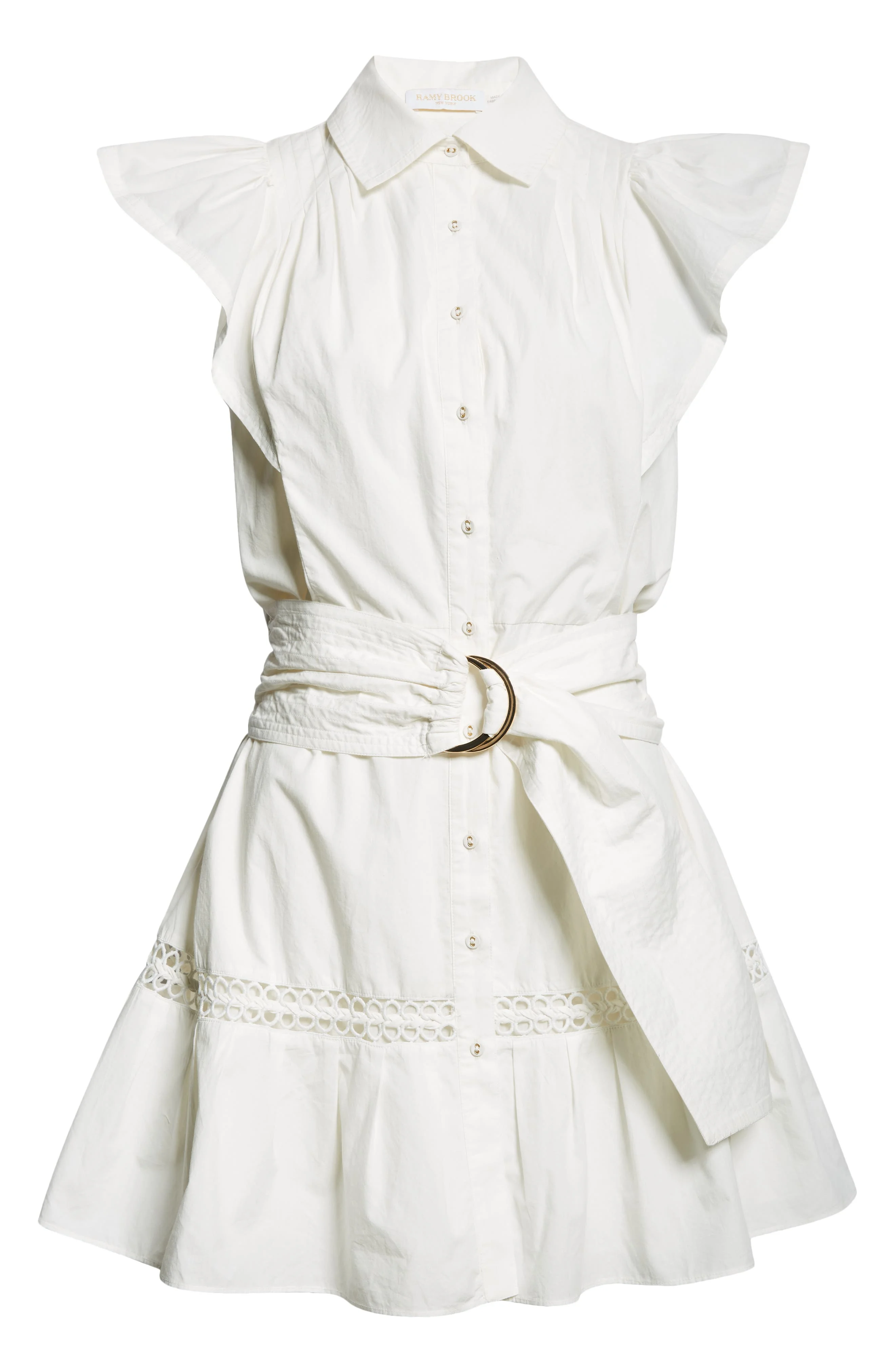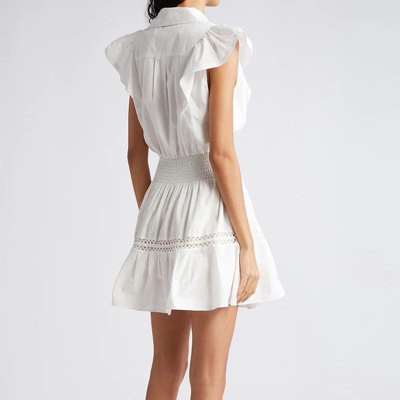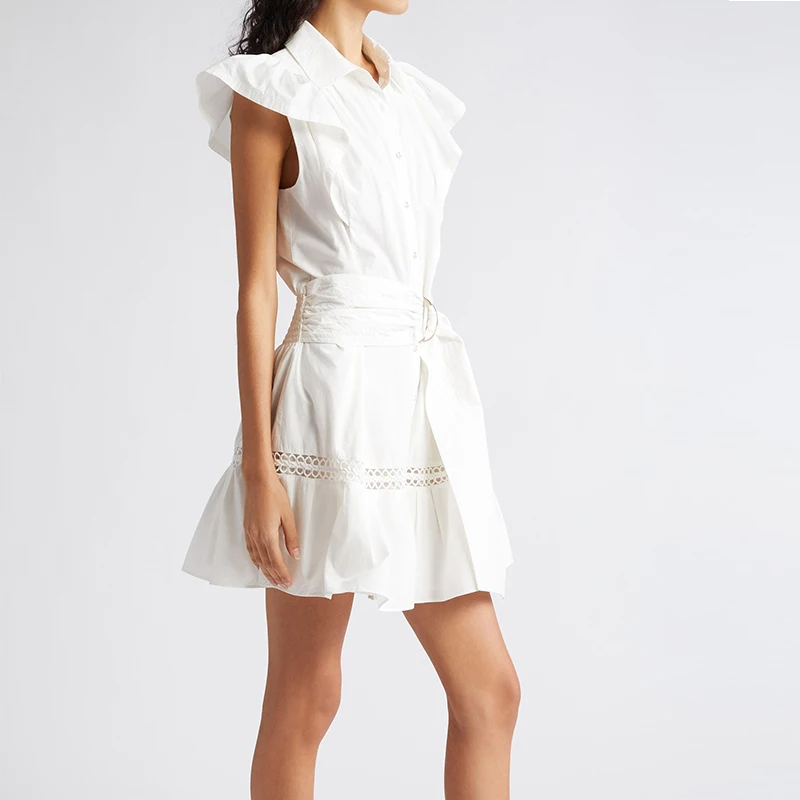 Lady Elegant Style Flutter Sleeve Belted Mini Shirt Dress With Solid Lace Insert Slim Wear Women's Dresses