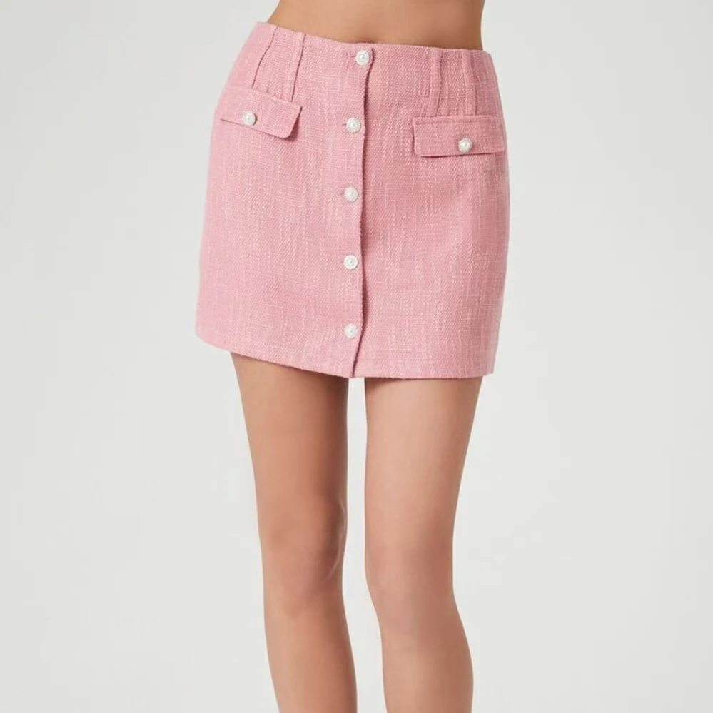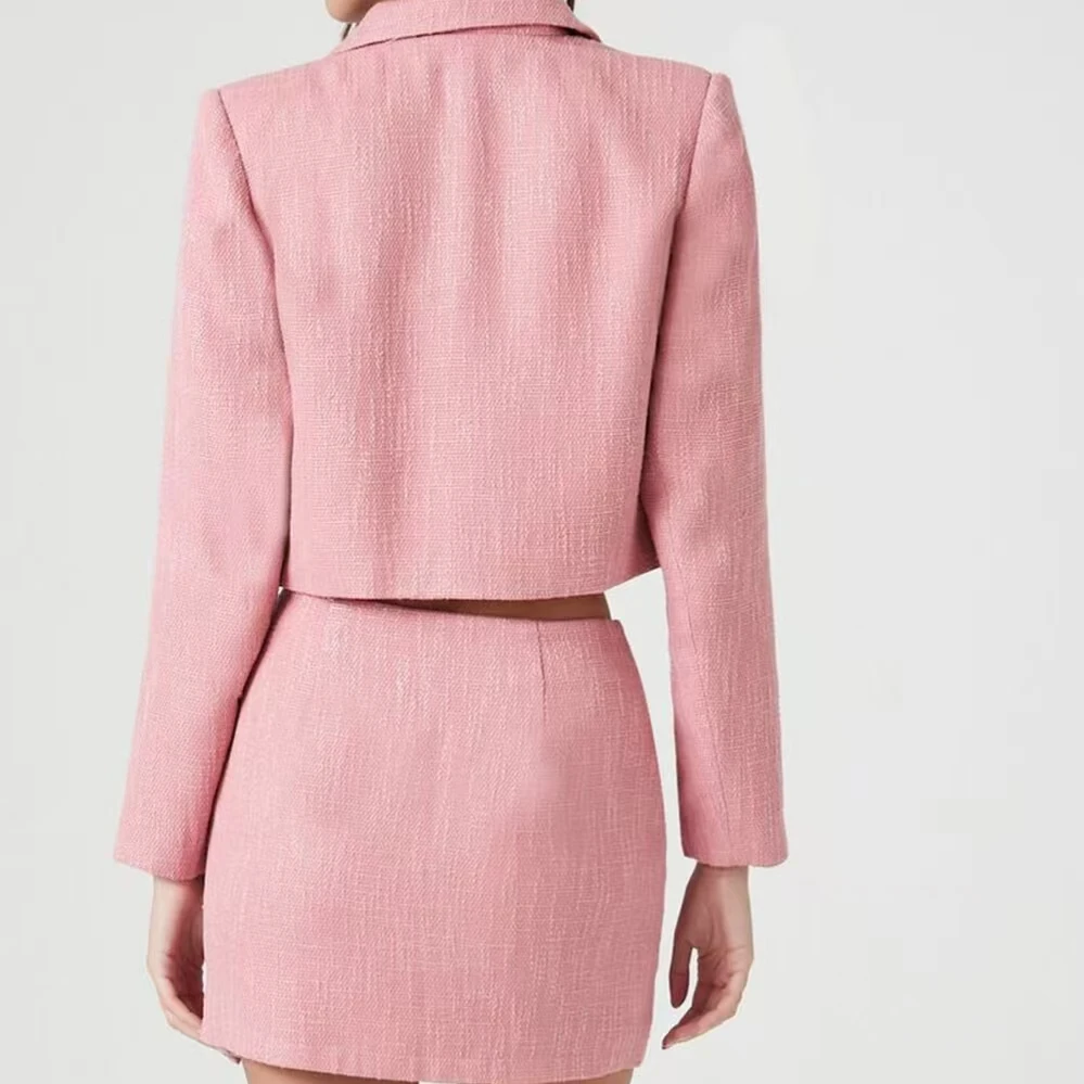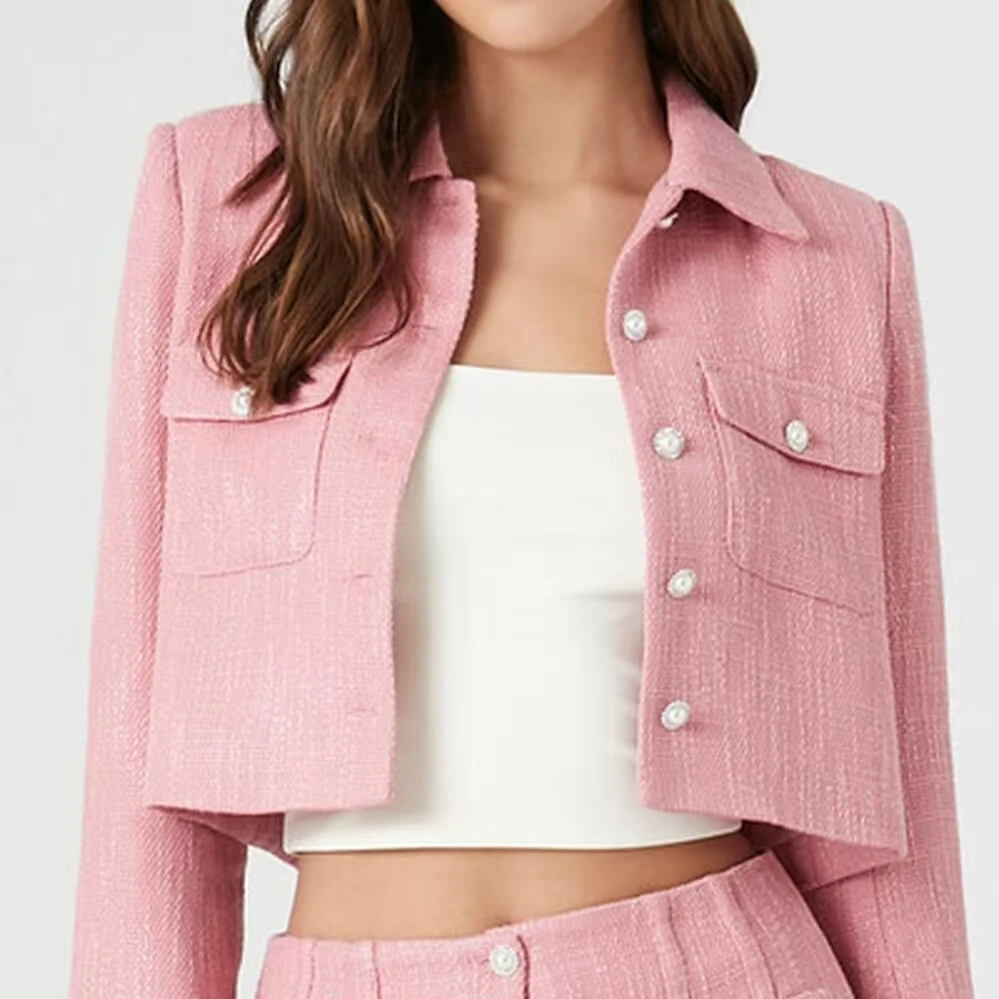 Women Elegant Career Tweed Cropped Jacket & Skirt Set With Faux Pearl Button-front Closures