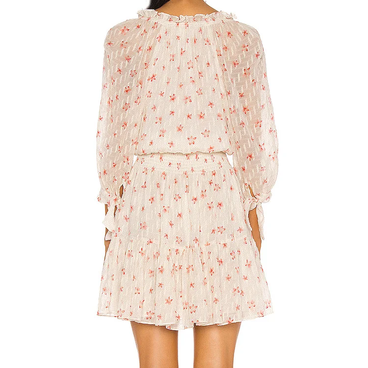 New Design Floral Printed Casual Silk Dress With Smocked Waist Tie Sleeves Mini Dress