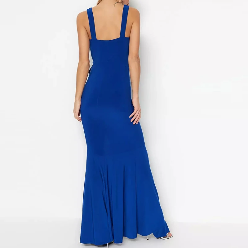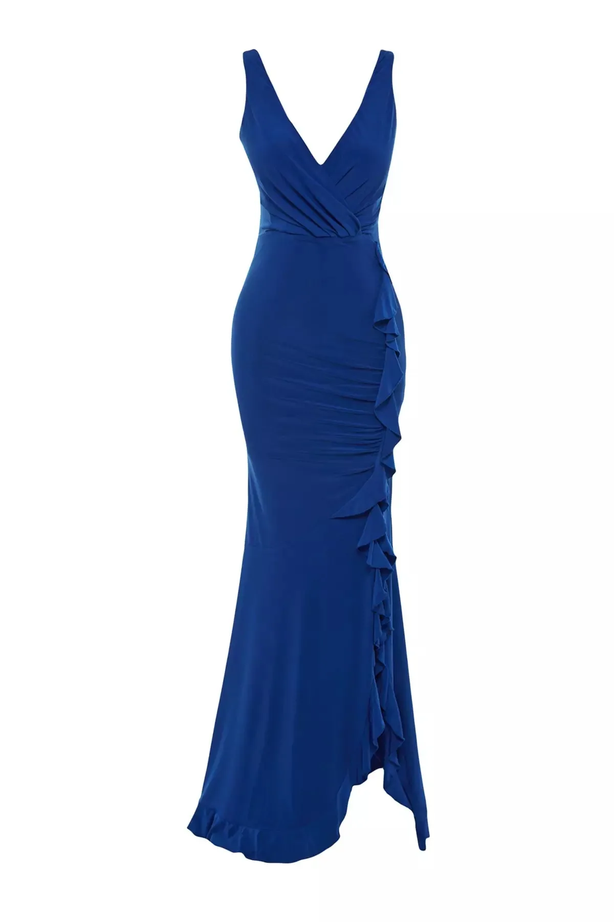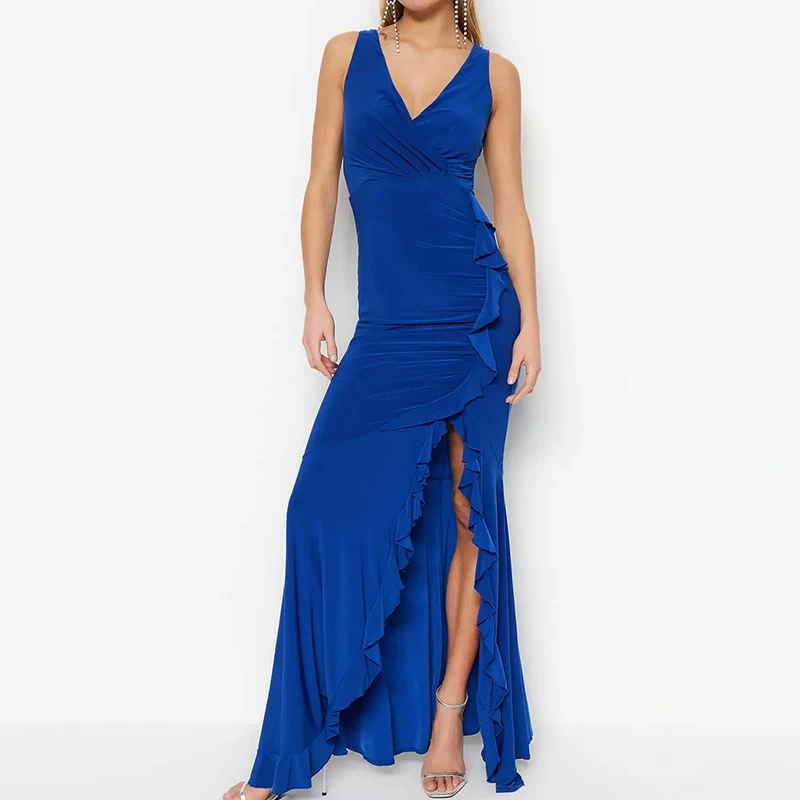 Lady Formal Style V-neck Bodycon Slit Maxi Dress With Solid Shade Ruffled Elegant Evening Women's Dresses