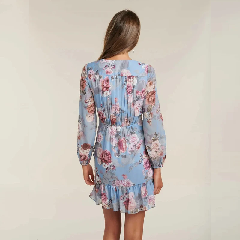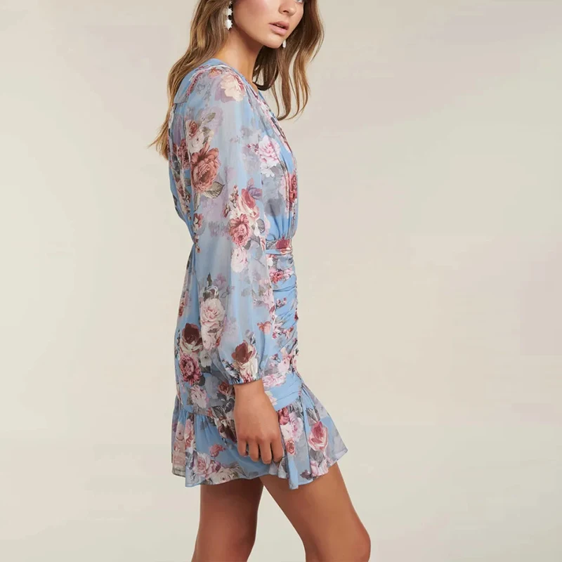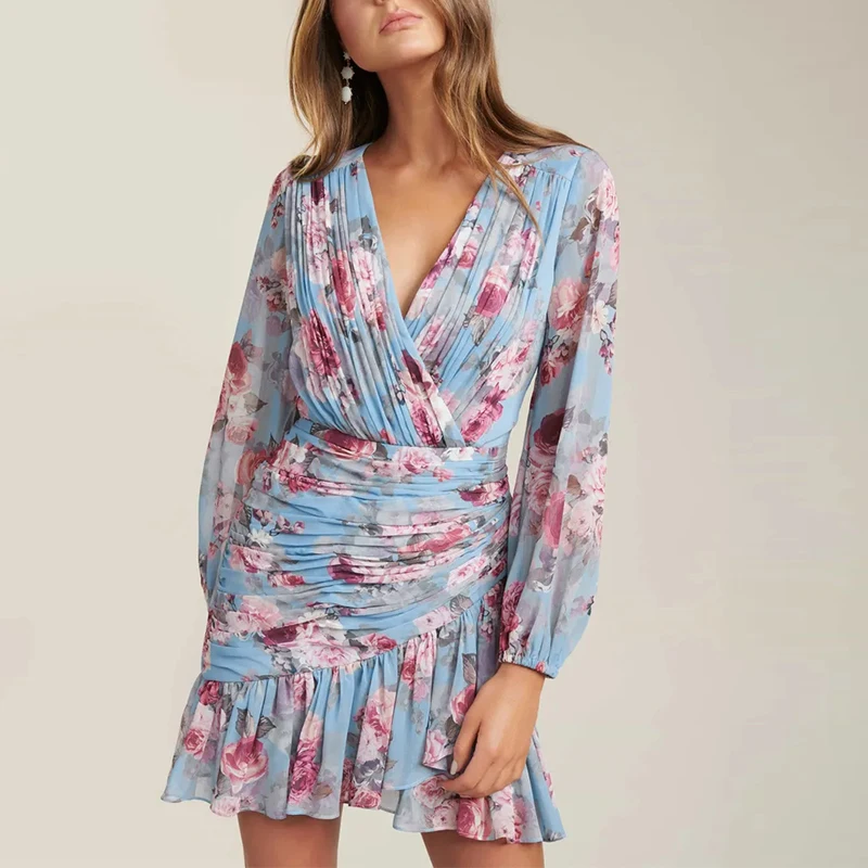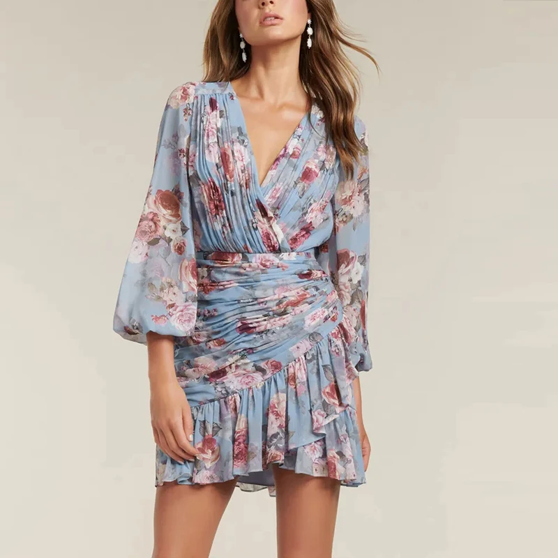 Women's Casual V-Neck Mini Dress Asymmetric Hem Lightweight Chiffon Floral Print Breathable Pleated Dress