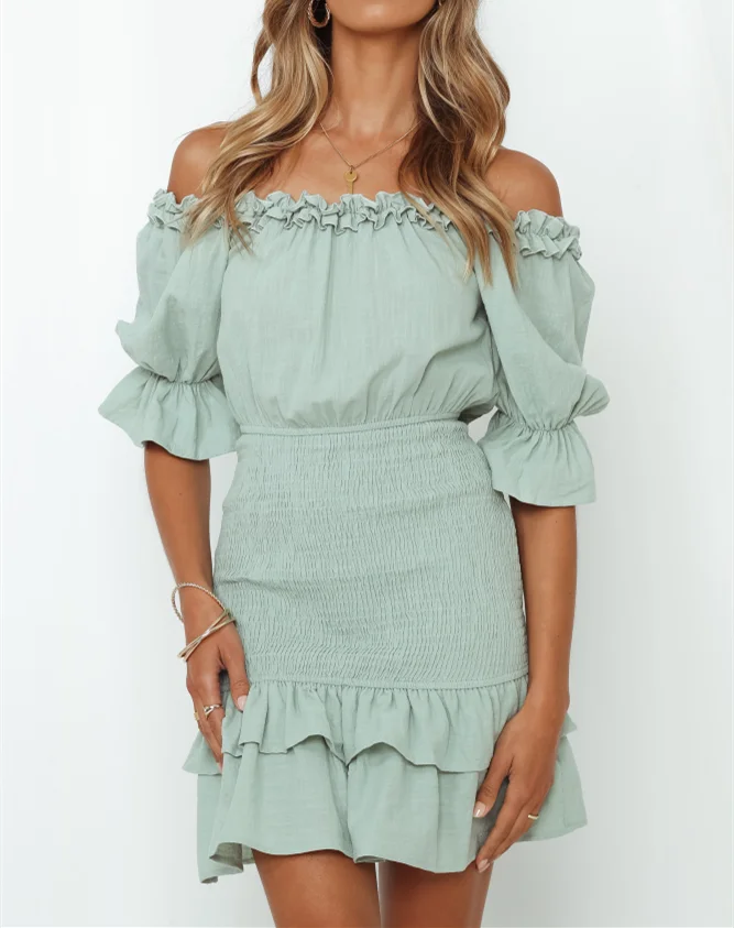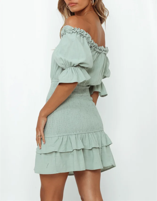 Custom Women's Mint Puff Sleeve Off-Shoulder Shirred Frill Trim Mini Dress Solid Sweet Dress