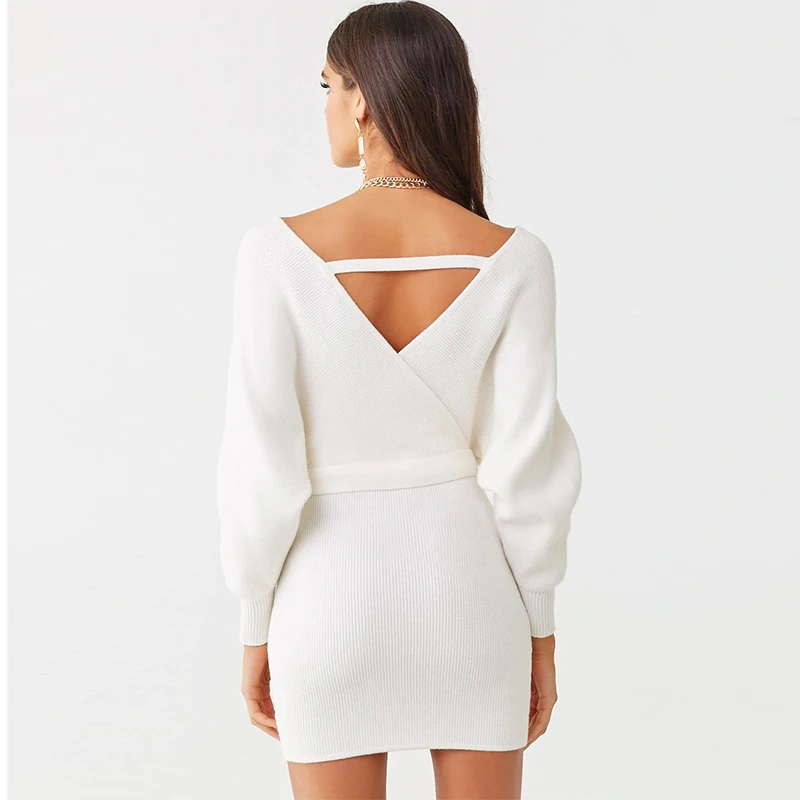 Women Ribbed Faux Wrap Long Sleeve Knit Mini Puff Sleeve Dress With Support Strap on Back a Removable Belt Dress