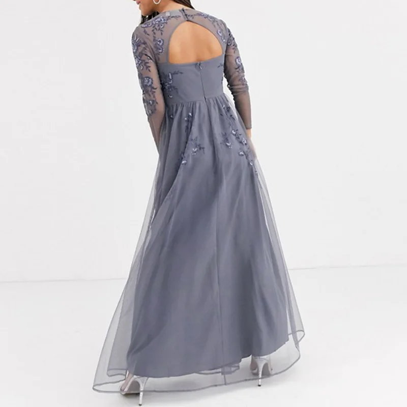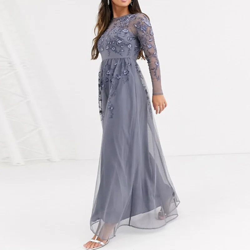 Women's Petite Long Sleeve Maxi Dress Elegant A-Line Embroidered Mesh With O-Neck Plus Size Evening Dress