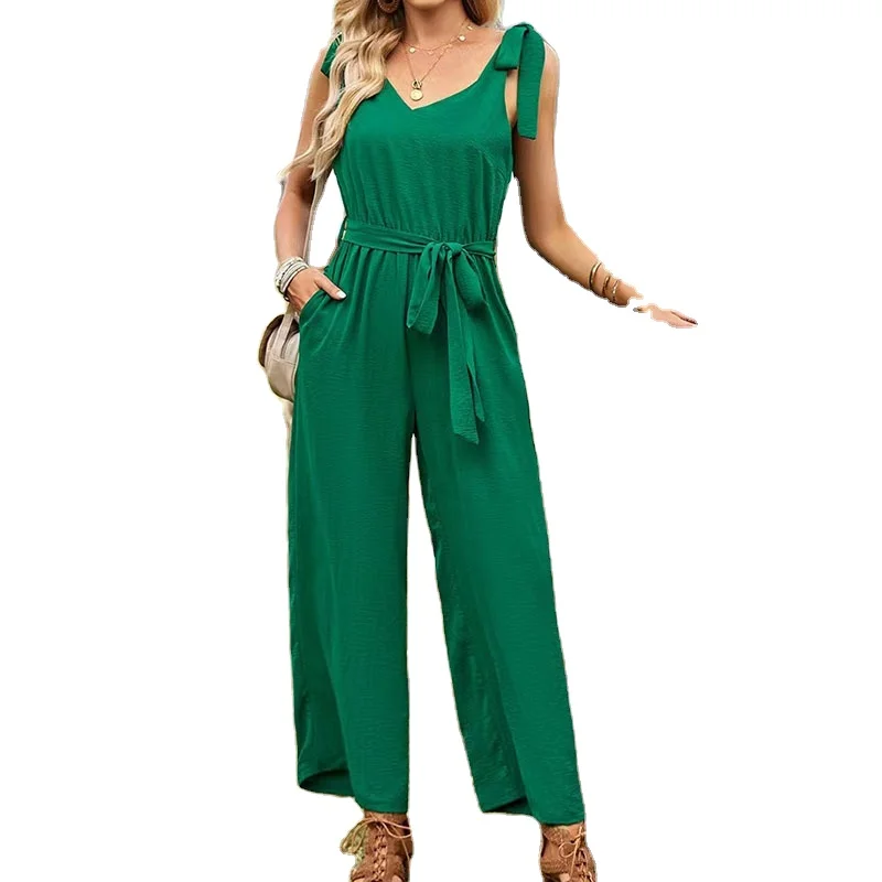 Summer Casual Waist Cinching Slimming Jumpsuit Pants Halter Collar Ankle-Length Solid Pattern Sashes for Commuting