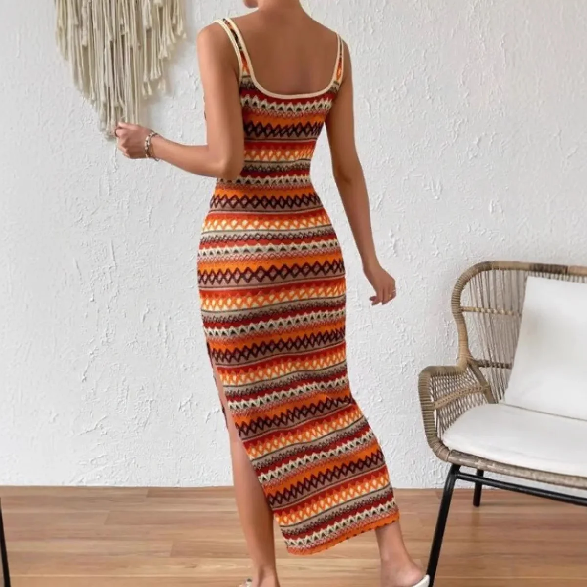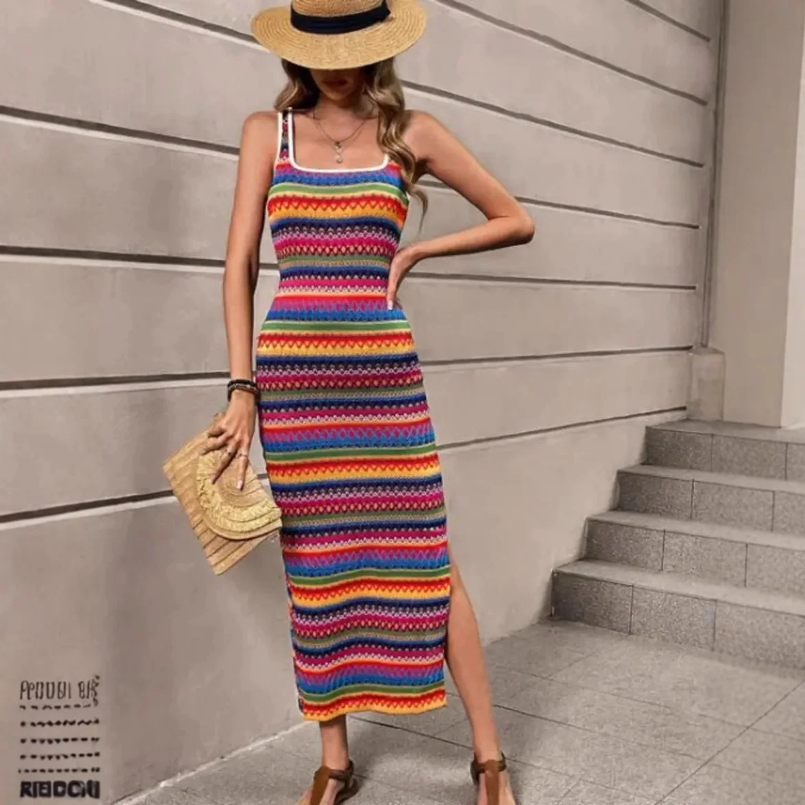Women's Summer Maxi Dress Custom Clothing Brand Casual Colored Striped Sleeveless Square Collar Spandex Daily Dress