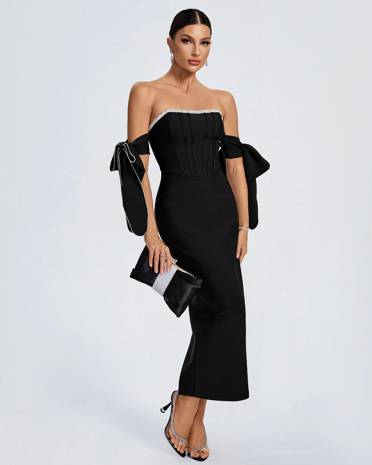 ZYHT 21938 Black Velvet Mini Dress Square Neck Long Puff Sleeves with Pearl Trim & Crystal Dess Flared Scalloped Hem Dresses