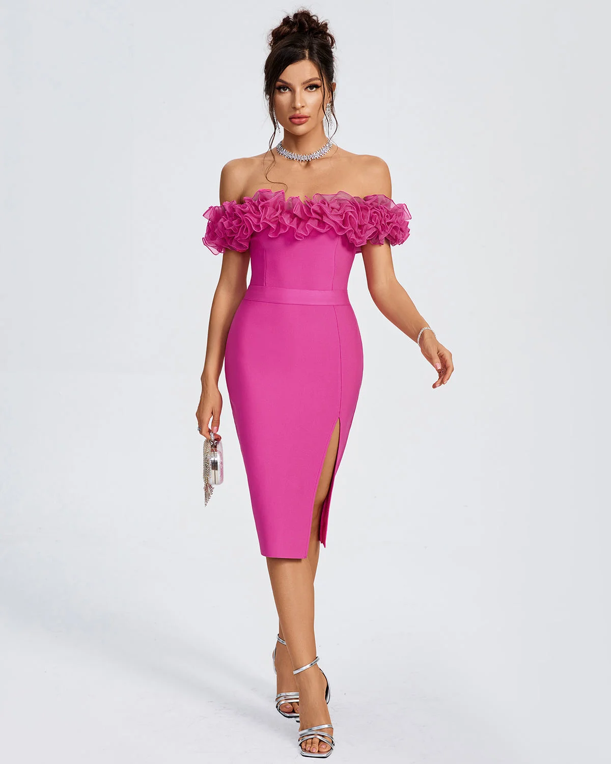 ZYHT 73903 Gemstone Crystal 3D Flower Decoration Ruched One Shoulder High Slit Long Sleeve Maxi Simple Elegant Evening Dress