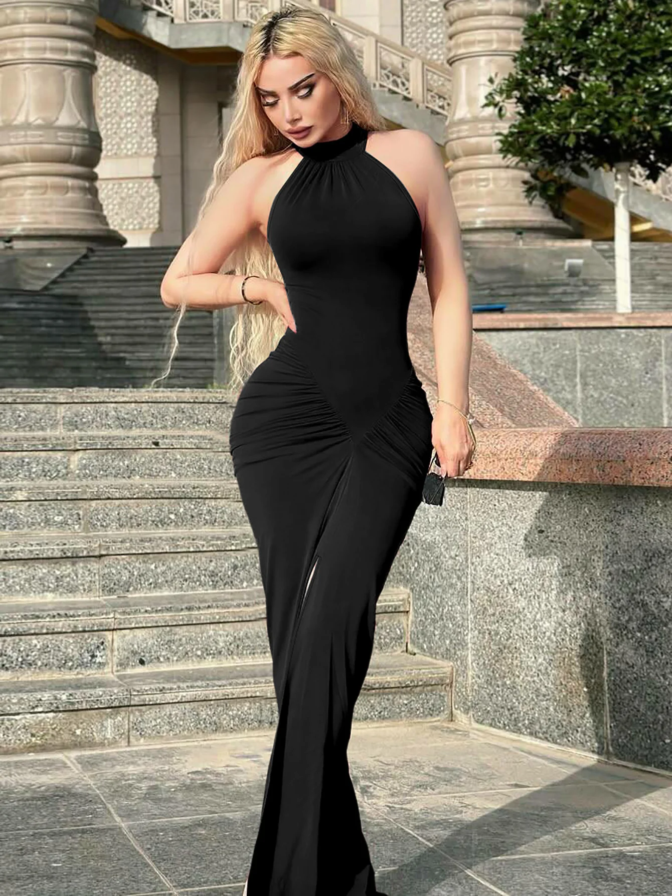 Summer Y2K Halter Slit Pleated Maxi Dress Custom Clothing Brand for Women Sleeveless Empire Lace Vestidos