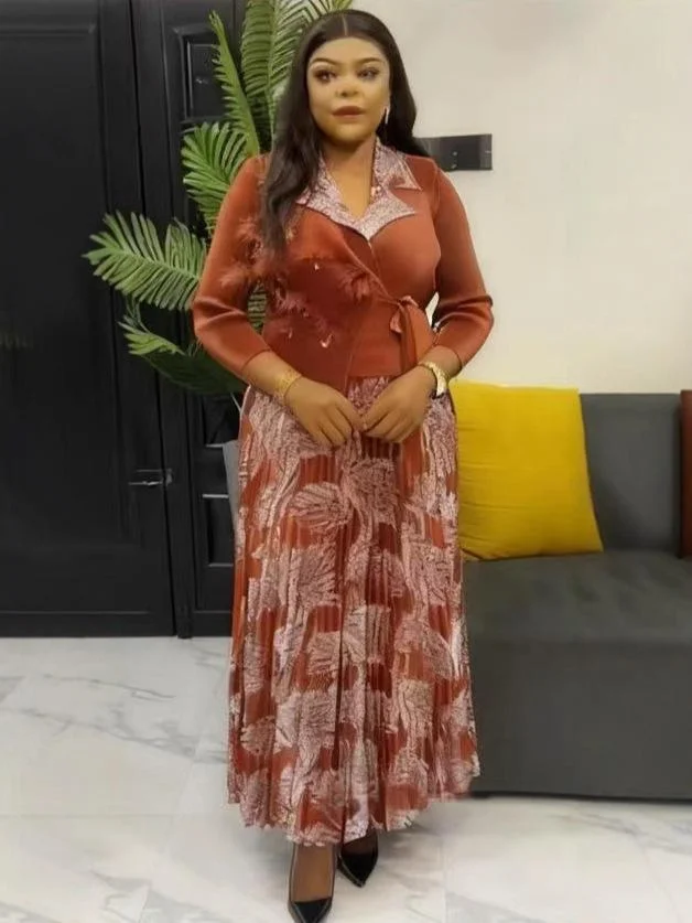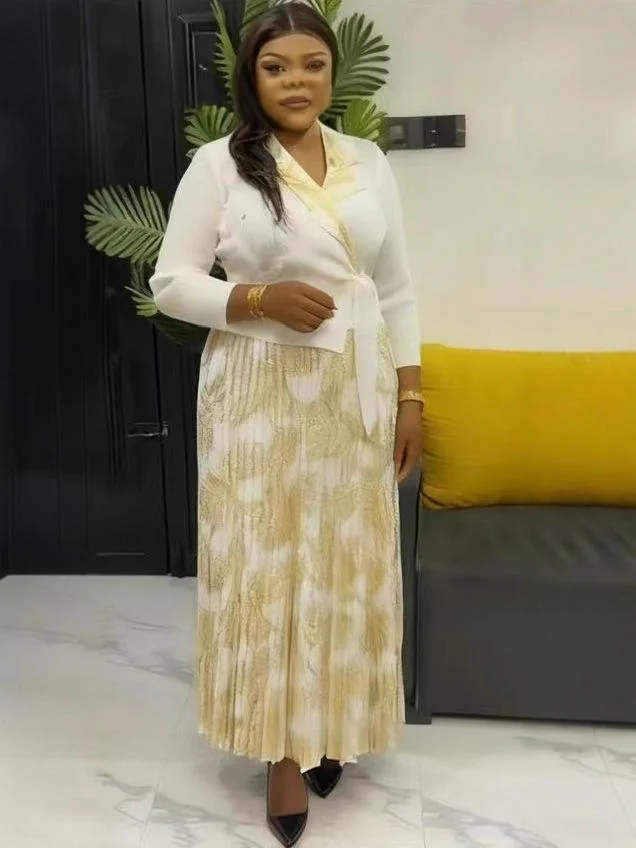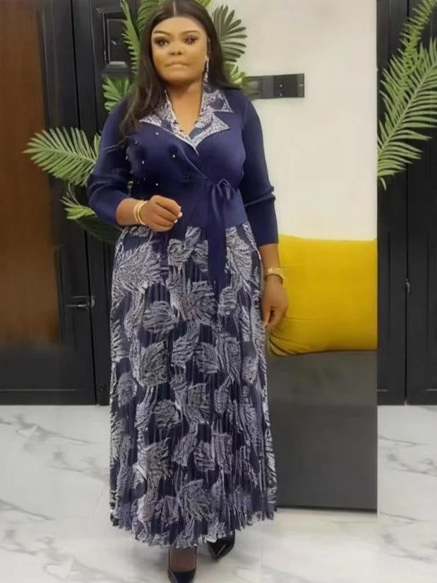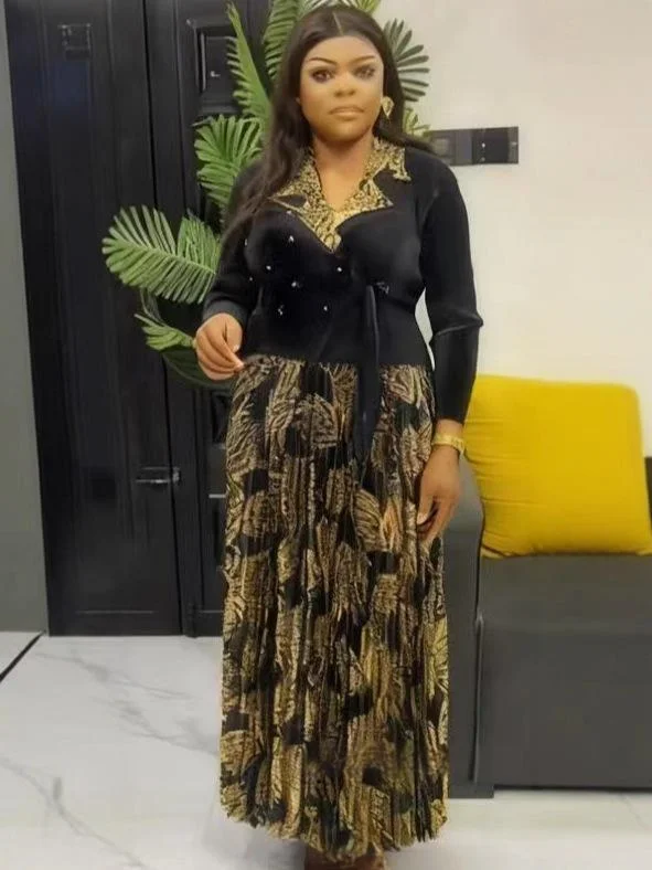 Wholesale Women's Autumn Casual Chiffon Silver Gold Stamping Pleated Anti-Wrinkle V Neck Shiny Beaded Maxi Dress Feather