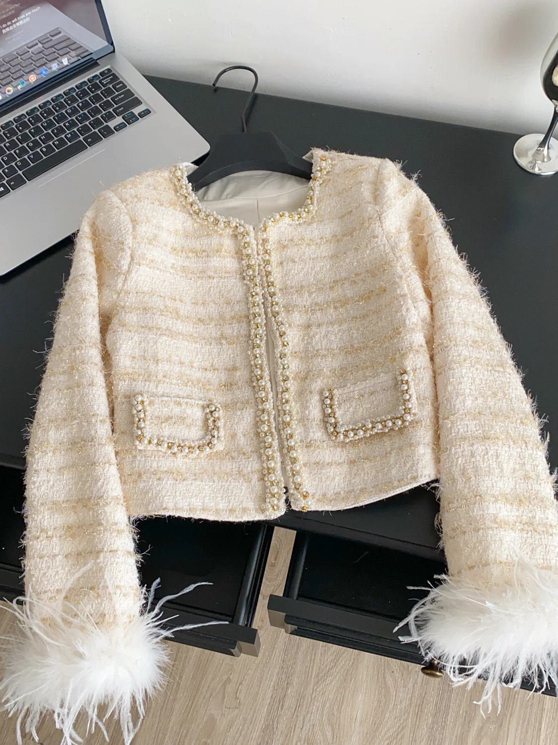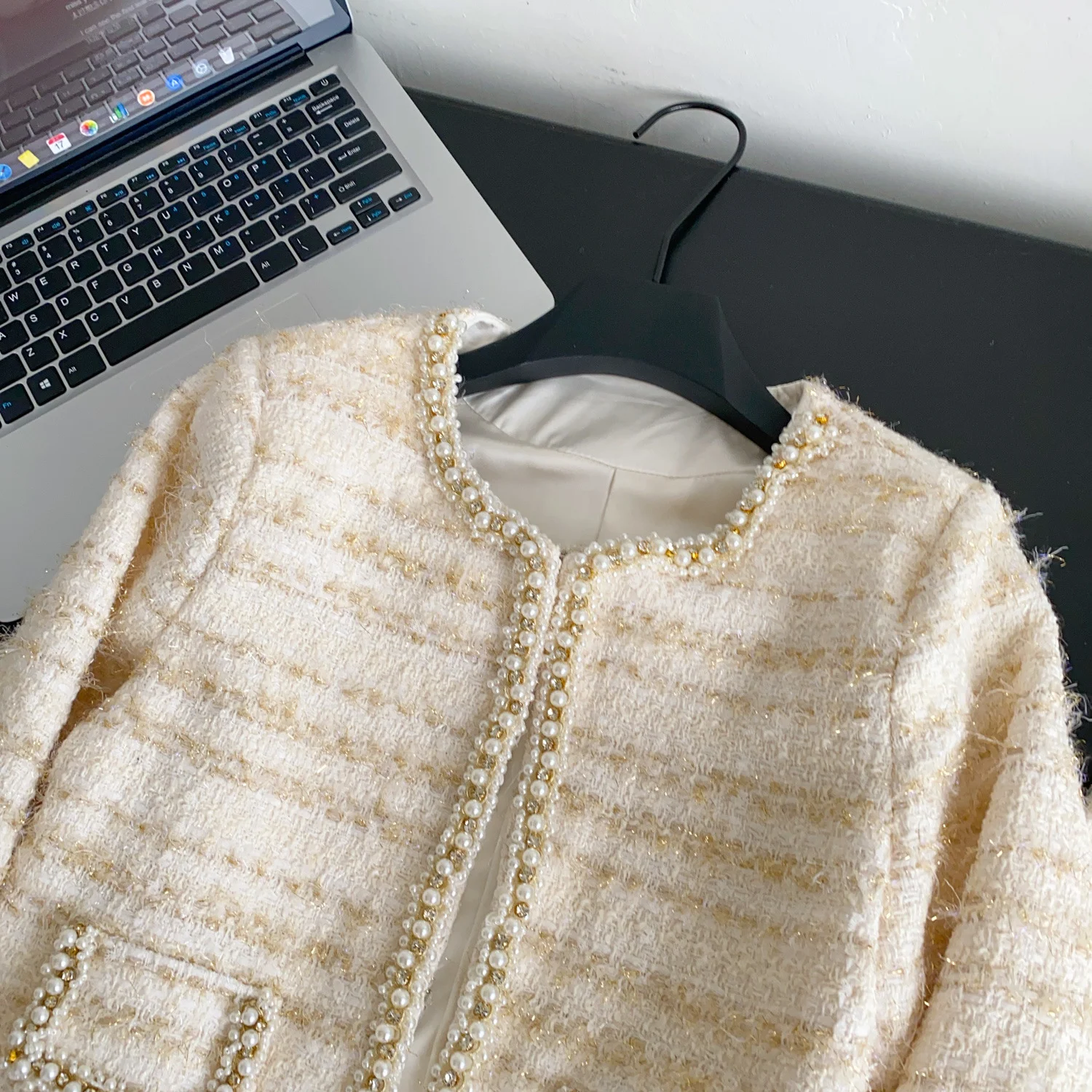 ZYHT 15545 Women's Blouses & Shirts Mint Green Tweed Blazer with Puff Sleeves & Peplum Fit Button-Detail Long Sleeve Jacket