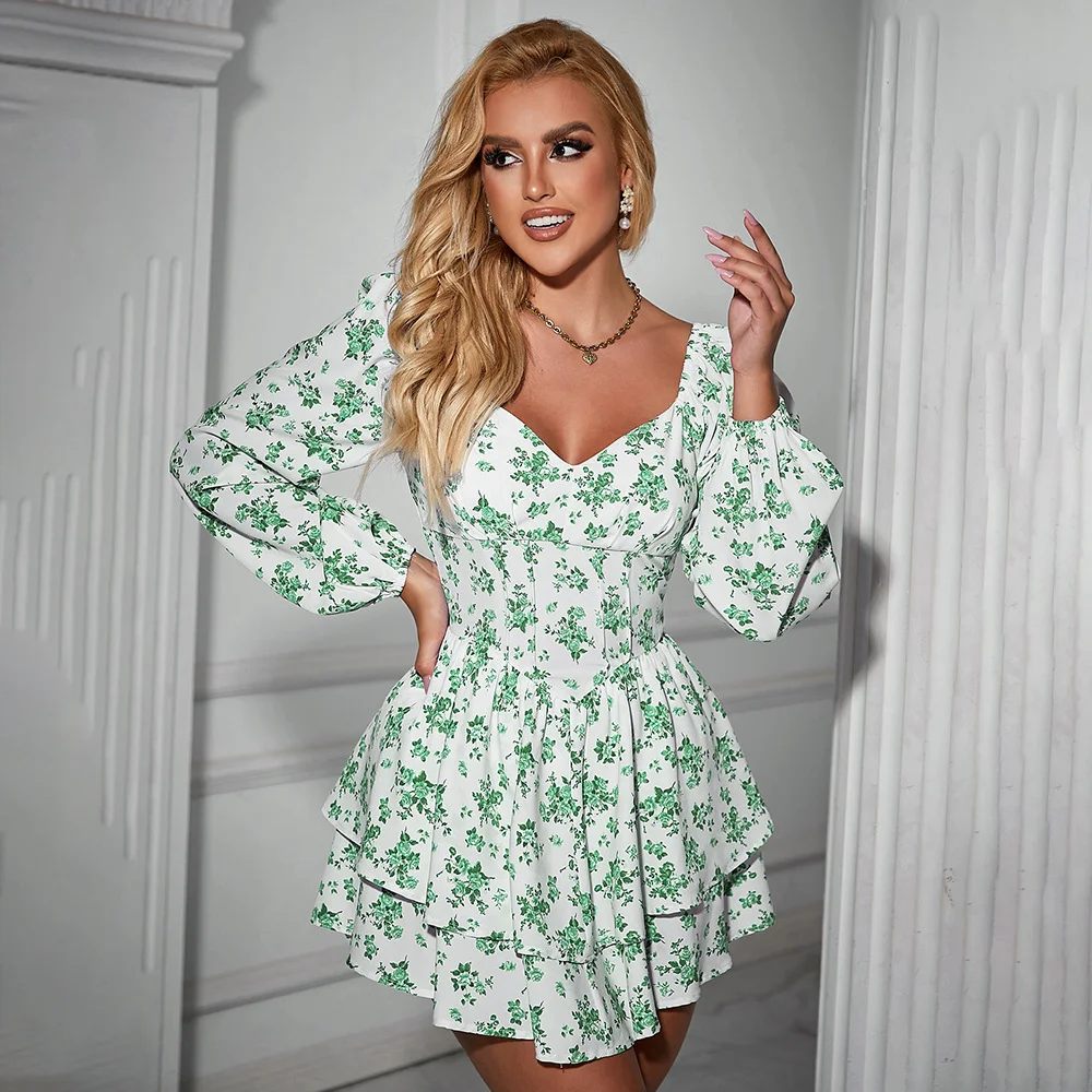 Elegant Vintage Flower Printing Mini Dress Long Sexy Sleeves Casual Women's Clothing Zipper Custom Brand Decoration Supply