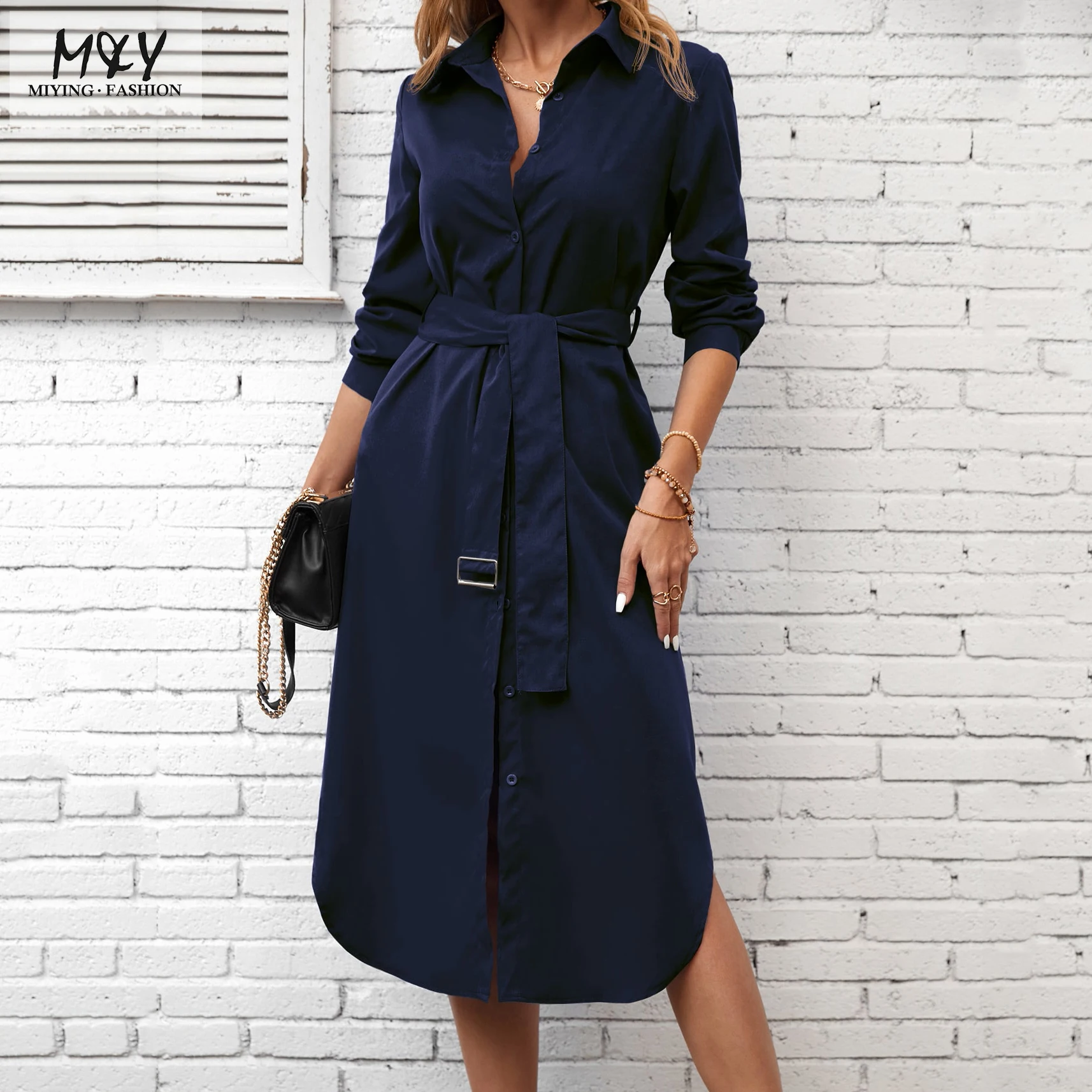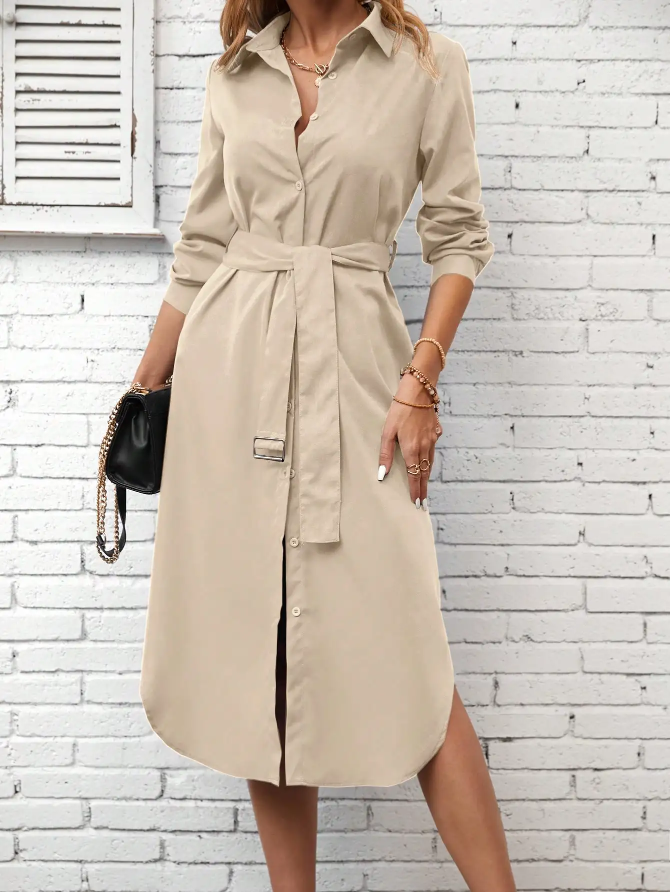 New Arrived Women's Daily Work Office Casual Shirt Dress Fashion Loose Fitting Straight Solid Button Front Belted Dresses