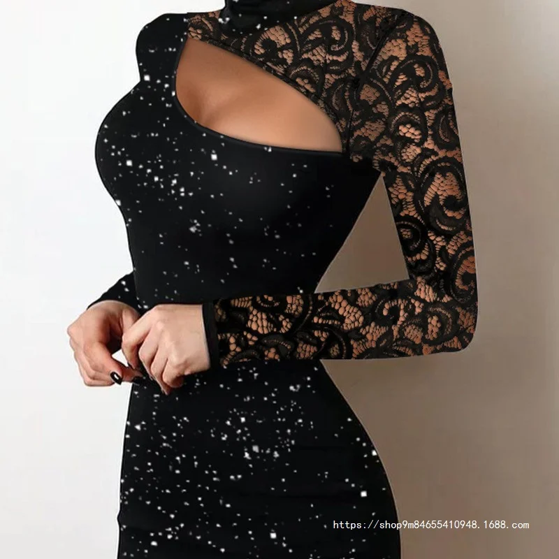 American Modest Lace Mini Dress with Long Sleeves Bodycon Skirt High Waist Anti-Wrinkle Hollow Out Decoration Casual Party Wear
