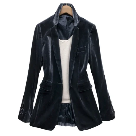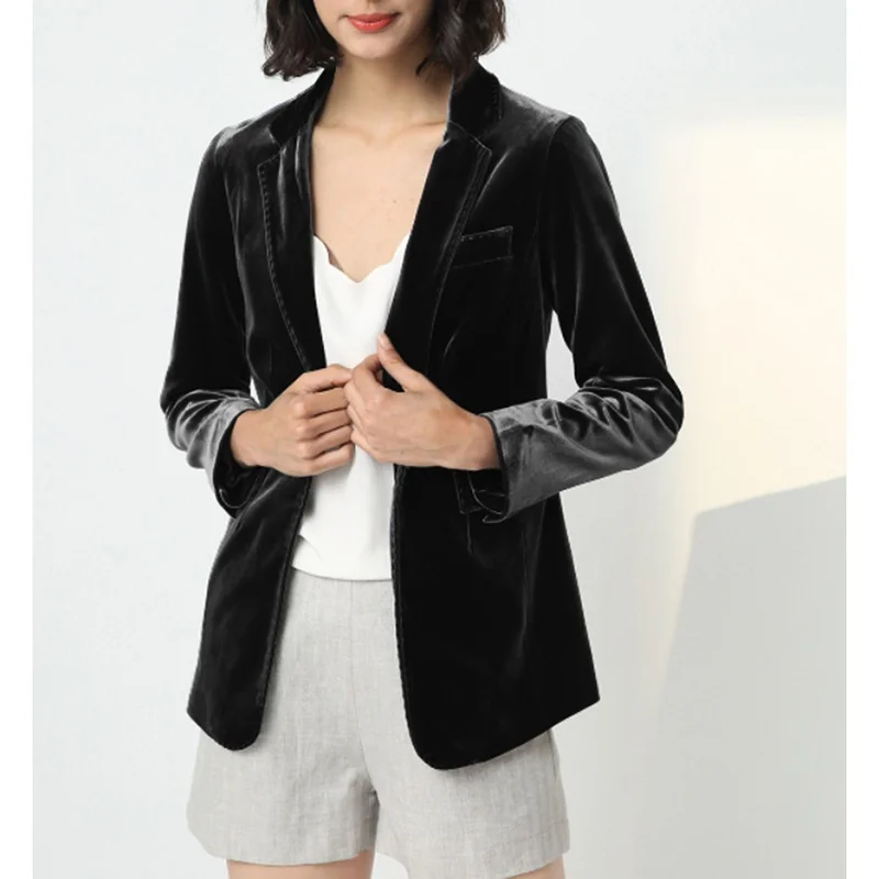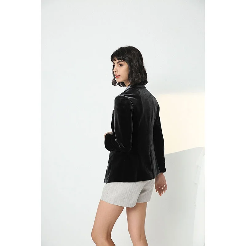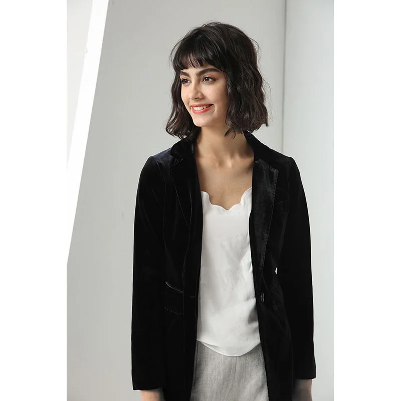 Skin Friendly Black Women's Single Breasted Long Woven Velvet Blazer with Button Closure Elegant Casual Pants Suits for Women
