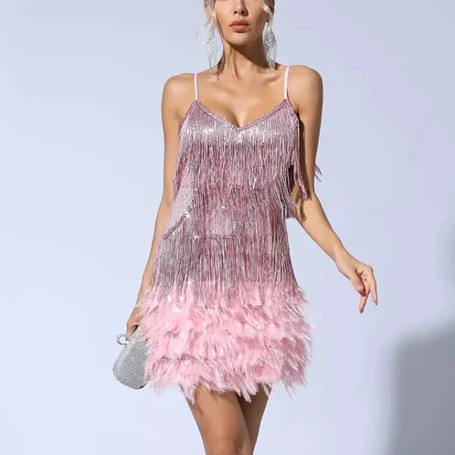 2026 New Sexy Sequin Tassel Feather Mini Dress Spaghetti Strap Stitching Party Dress Women's Elegant Evening Club Wear