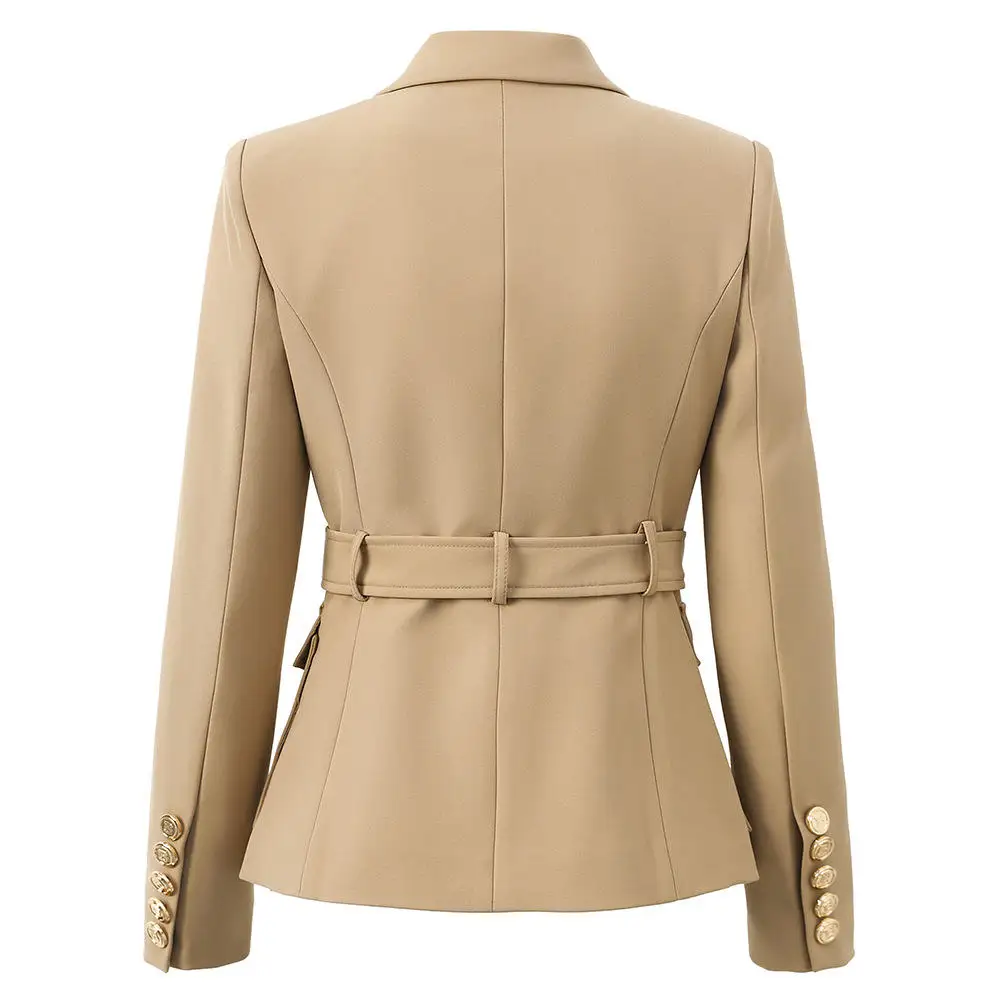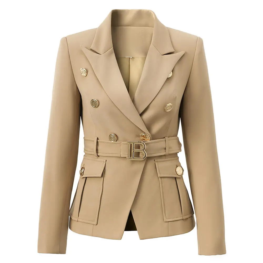 2026 Fashion Gun Collar Suit Jacket Double-Breasted Belted Jacket with Gold Buttons for Office Work Slim Fit Formal Wear