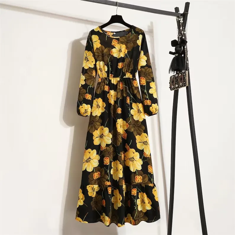 Women's Spring Summer Maxi Casual Dresses Floral Printed Long Sleeve O-Neck Boho Beach Party Long Dress Mujer Vestidos