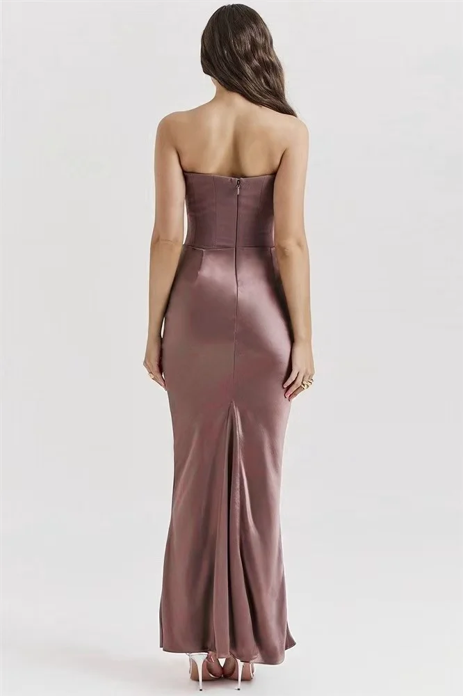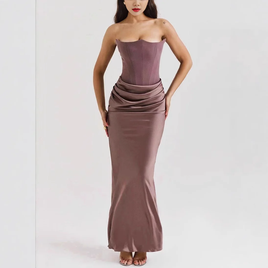 Women's Summer Satin Dress Strapless Backless Midi Evening Party Dress Sexy Slim Patchwork Natural Waistline