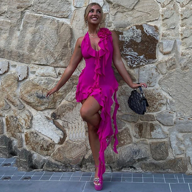 Fashion Women Long Ruffled Beach Transparent Elegant Sexy Dresses Deep V-neck Knitted Chiffon Club Party Dress for Vacation