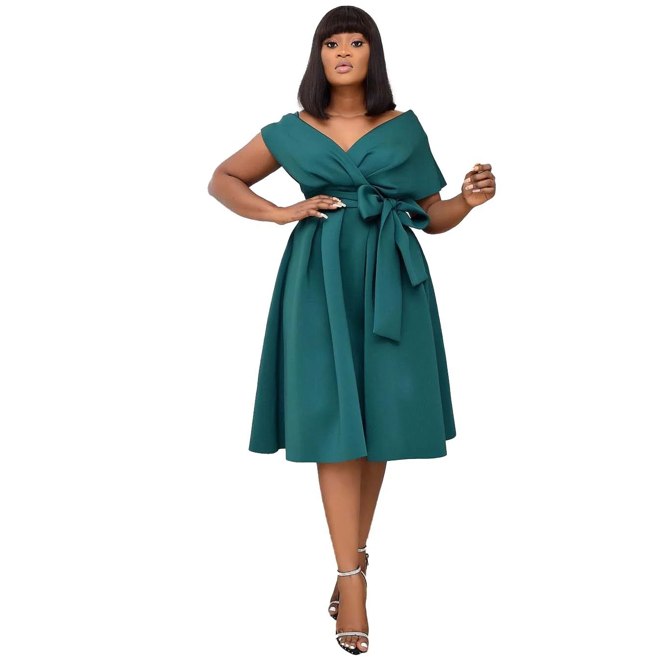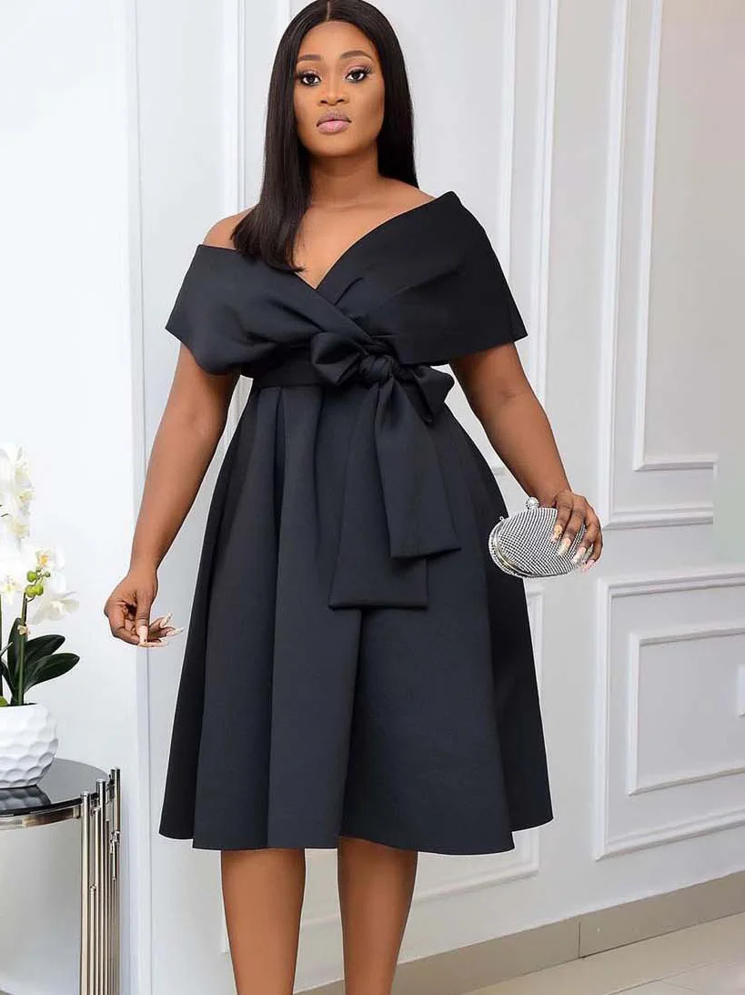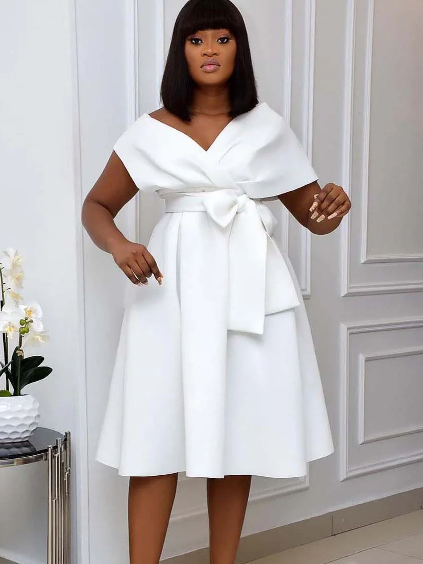 New Style Women Short Sleeve V-neck Sexy Satin Solid Plus Size Dress Belt Shoulder Lady Elegant A-line Big Swing Casual Dress