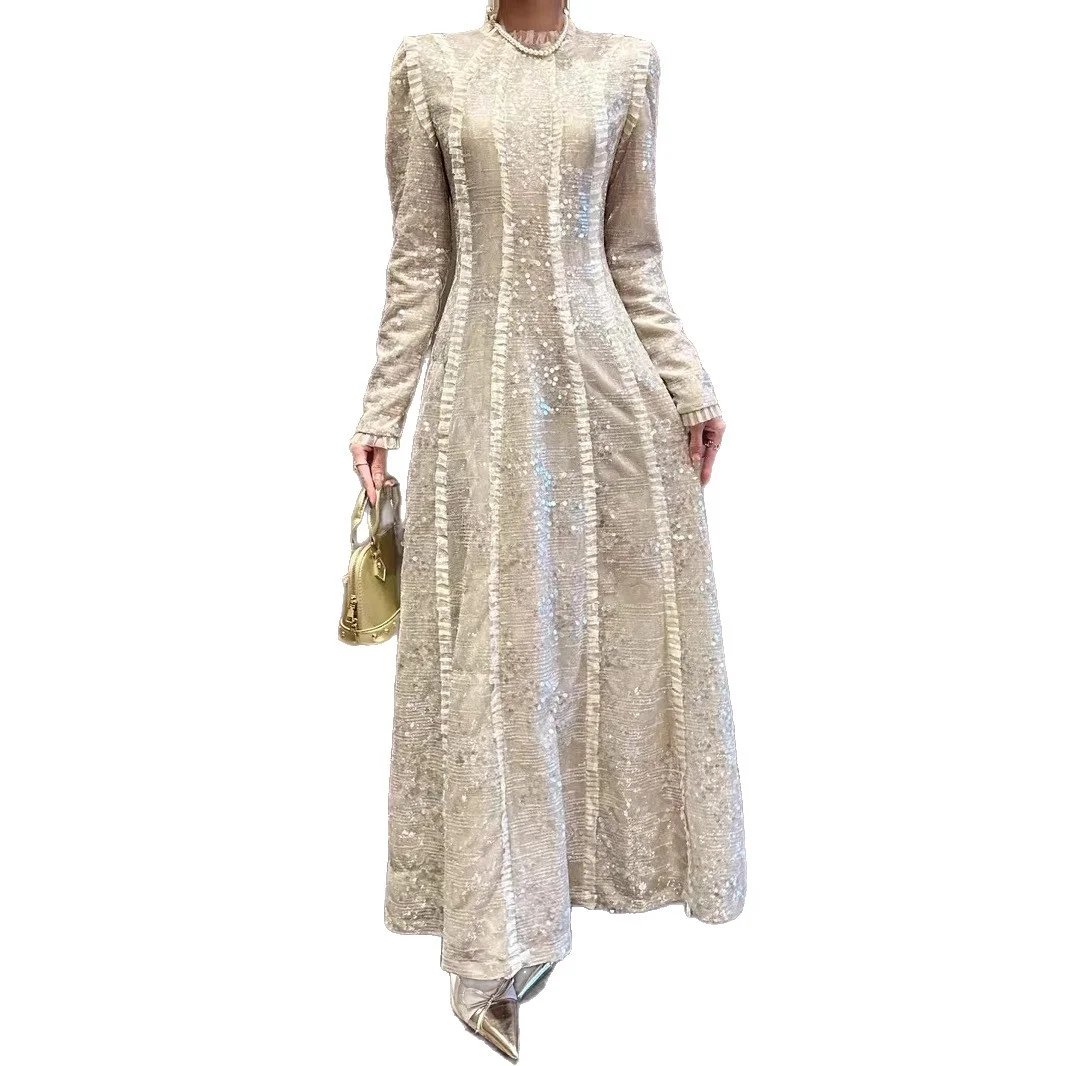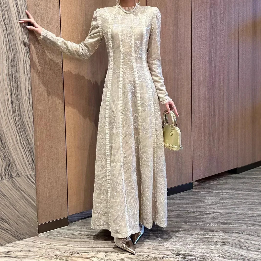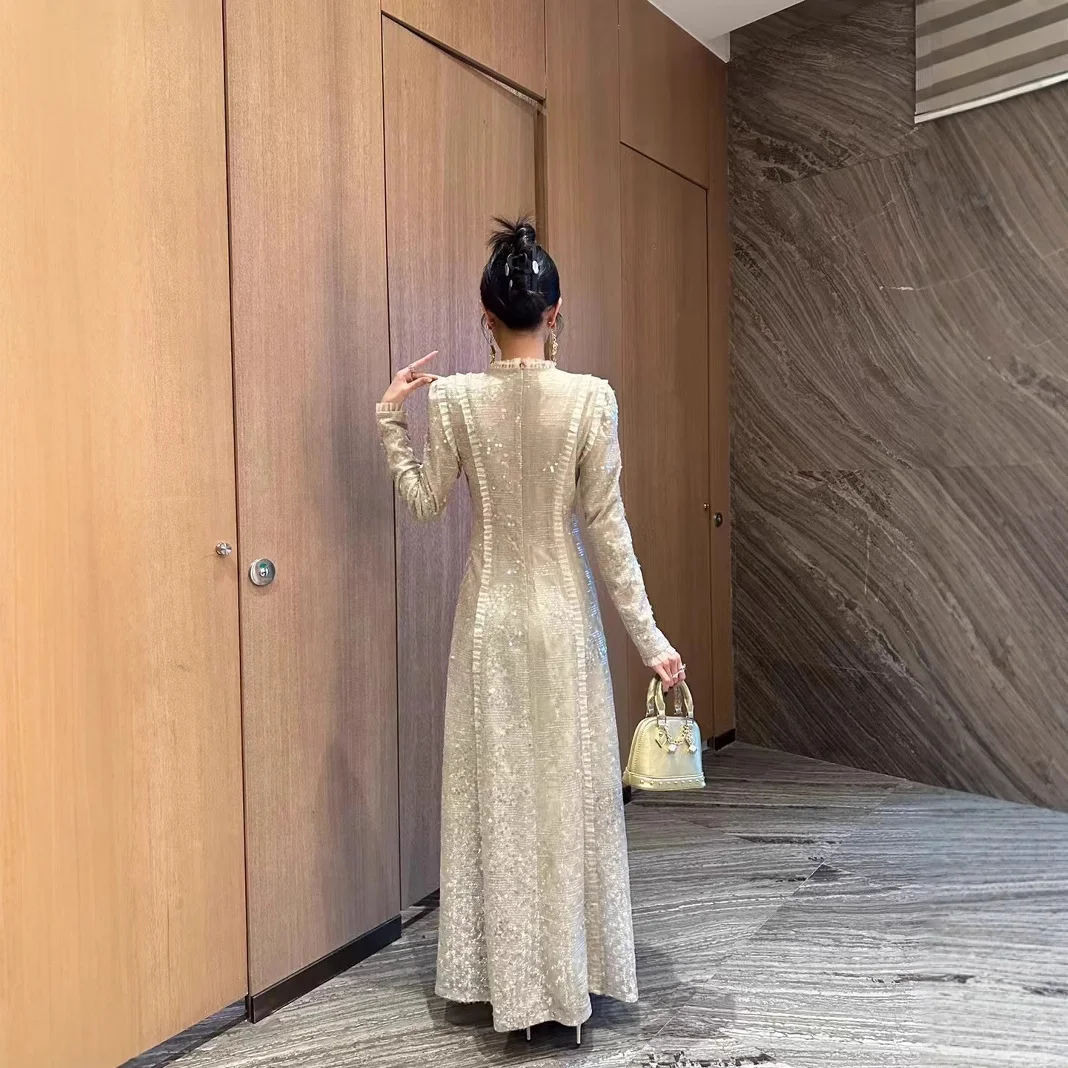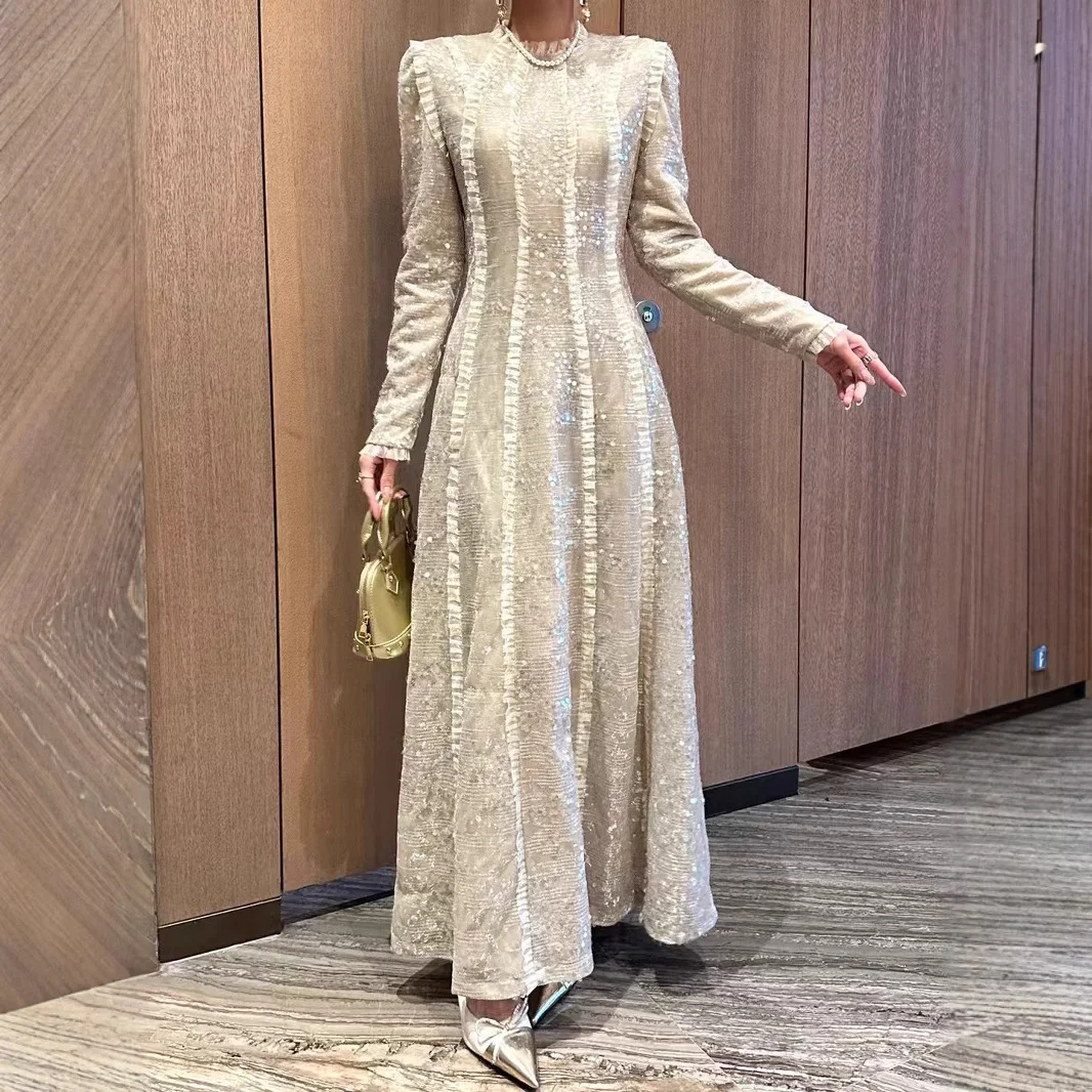 Autumn Evening Party Maxi Dress for Women Sequined Tulle Mesh Floral Patchwork Ruffle Lace Beading Long Sleeve Empire Waist