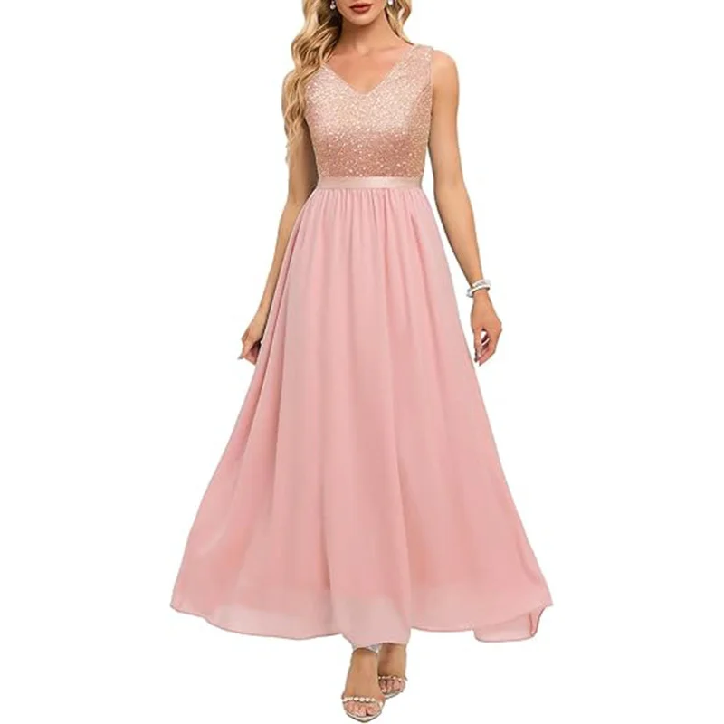 Women's V-neck Sequined Empire Waist Bridesmaid A-line Long Chiffon Formal Evening Dress Gown with High Waist