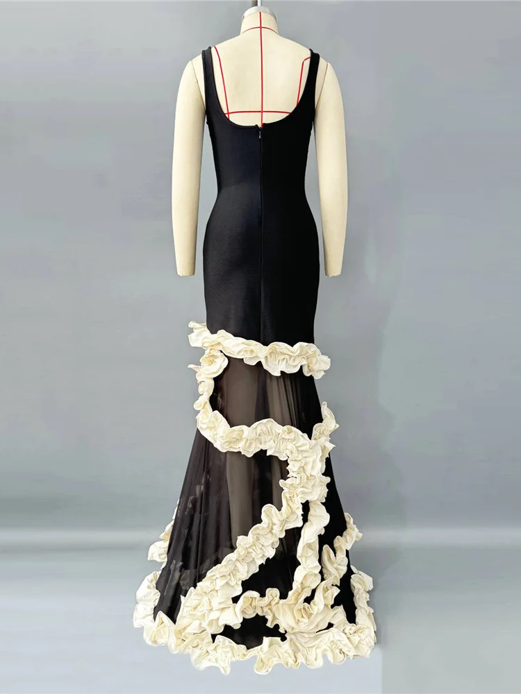 Hot Sale High Quality Women's Elegant Black Floor-Length Empire Waist Dress White Flower Sleeveless for A-Line Party Long