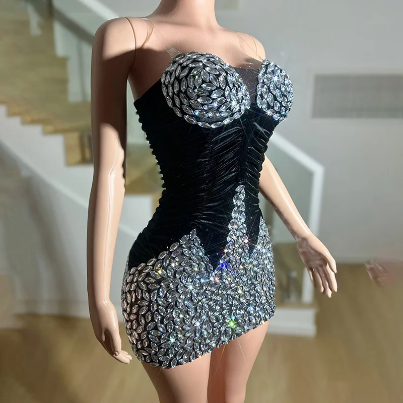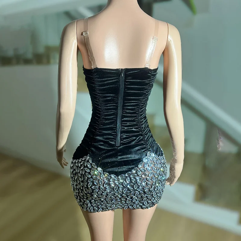 Women's Romantic Velvet Evening Dresses Plus Size Luxurious Rhinestone Halter Neck Puff Printing