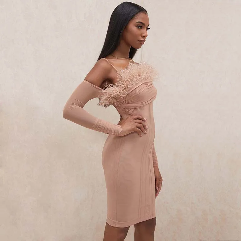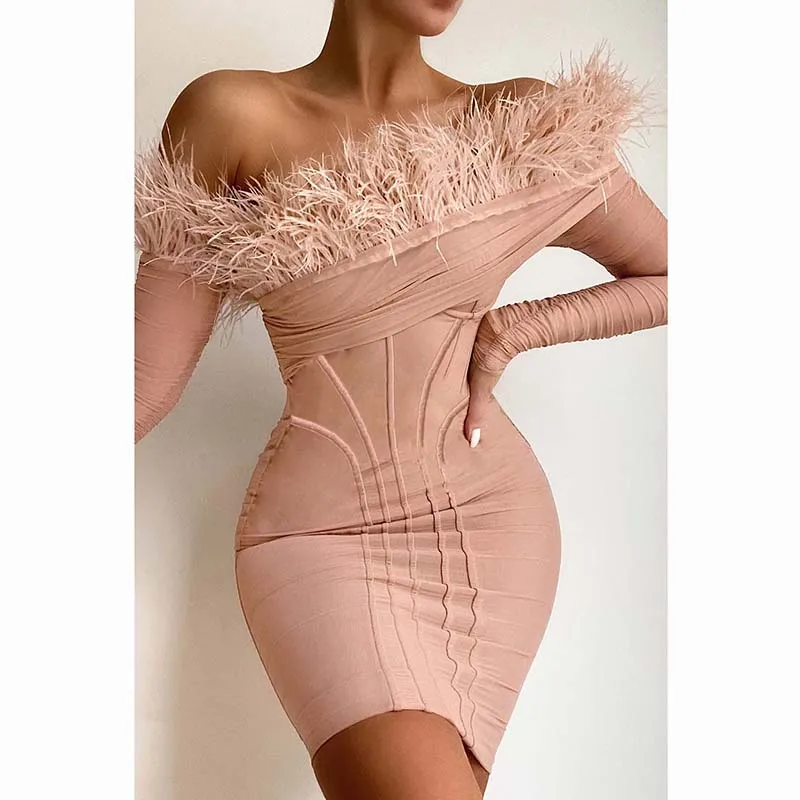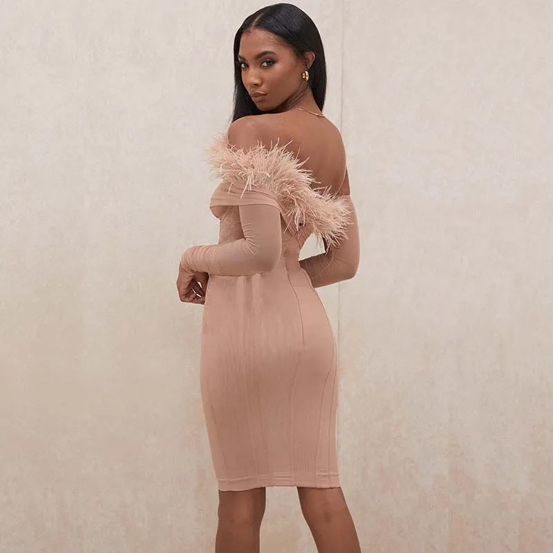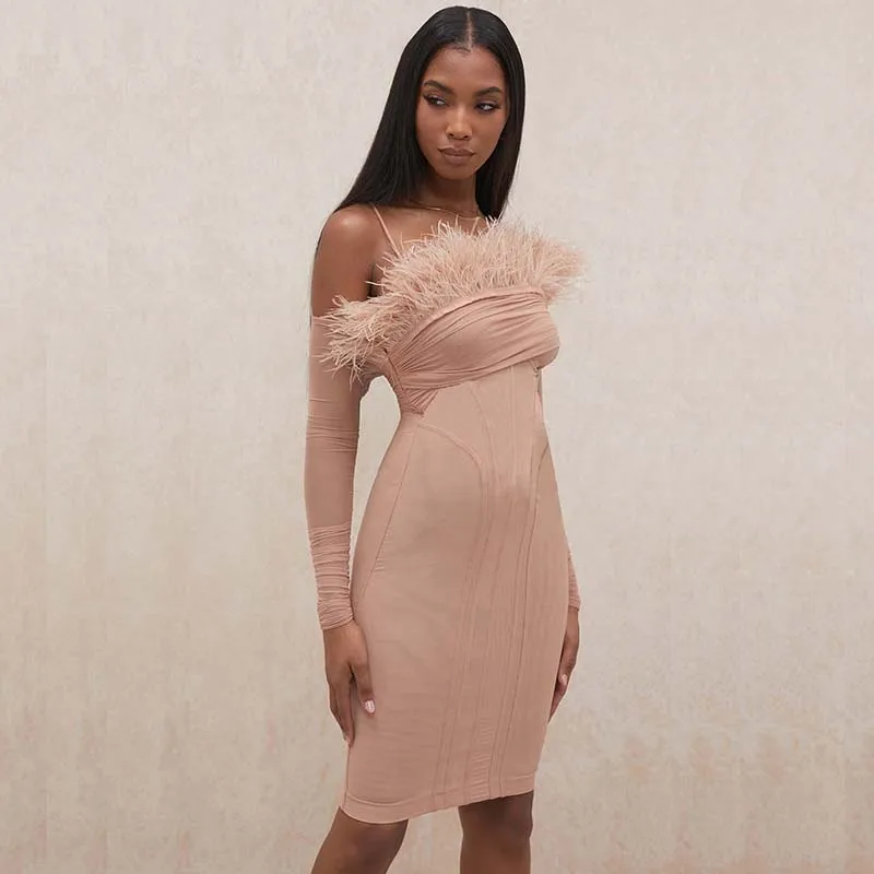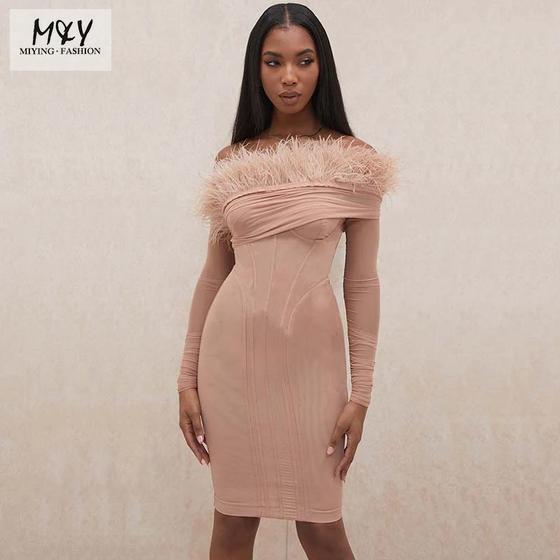MIYING OEM Custom Feather Trim Dress Off-Shoulder Bandage Midi Dresses Banquet Cocktail Elegant Evening Gown