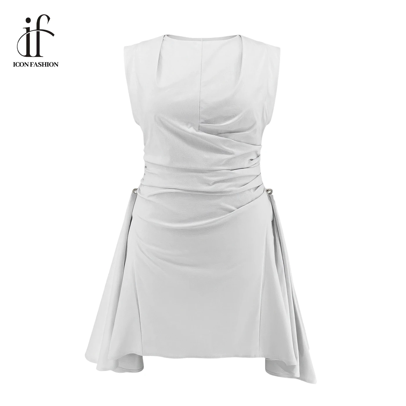 2026 Summer Women's Pleated Mini Dress Retro Round Neck Sleeveless Casual Dress Waist Slimming A-Line Short Skirt