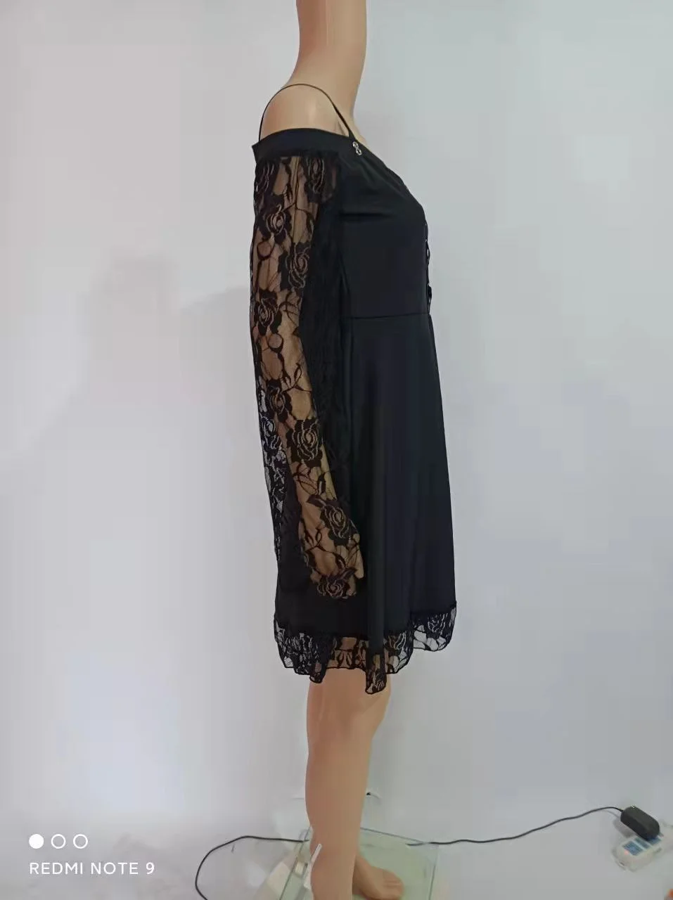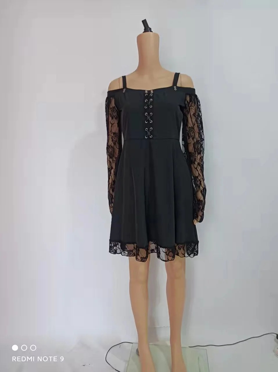 Lace Long Sleeve Patchwork Slim Empire Waist Dresses Casual Gothic Sexy Cascading Ruffle Bow Knee-Length Skirt