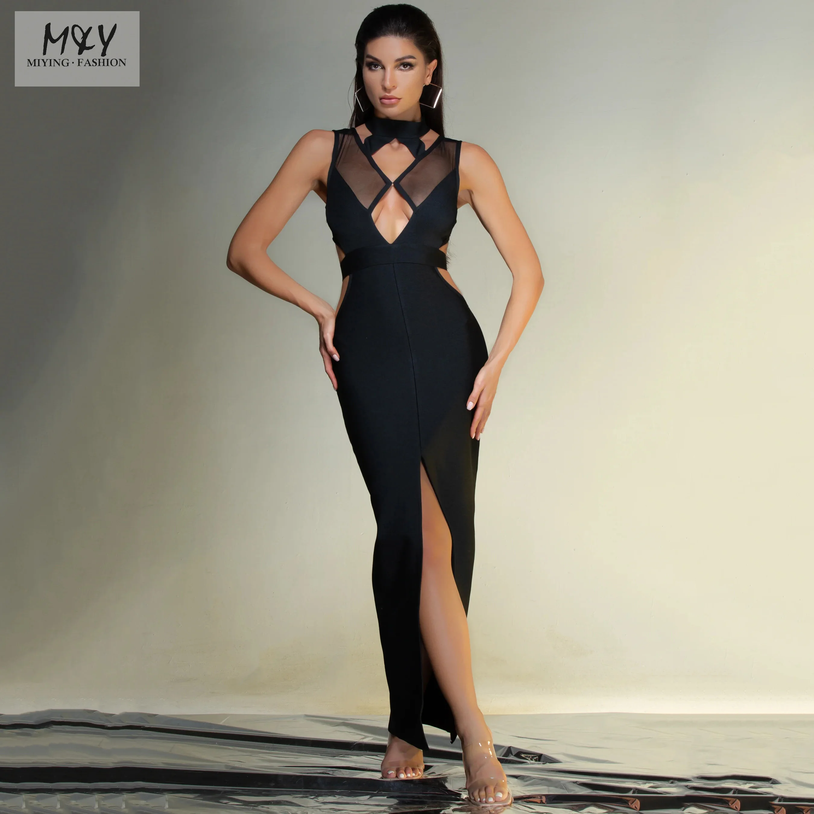 MIYING Fashion Black Bandage Evening Dress Sexy Hollow Cut Spliced Transparent Party Dress Elegant Slit Prom Evening Gown