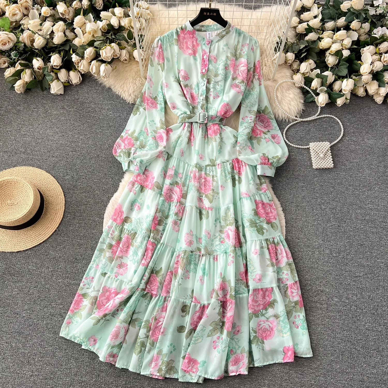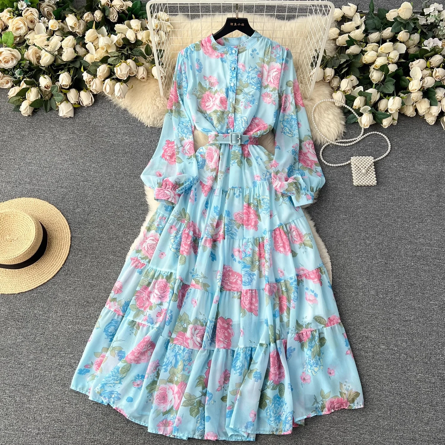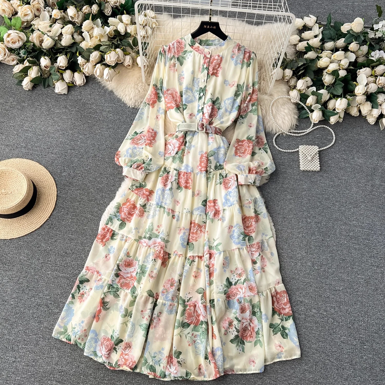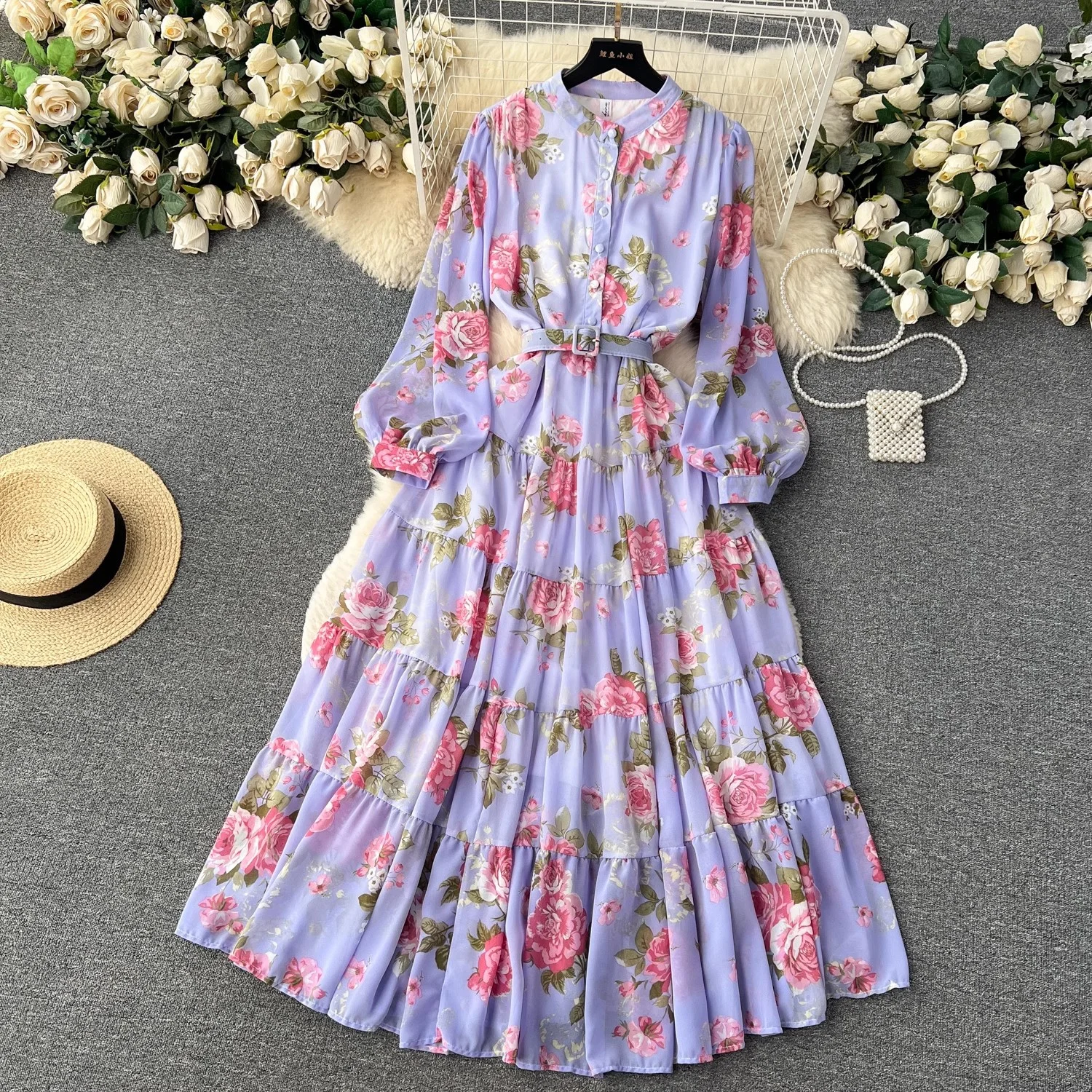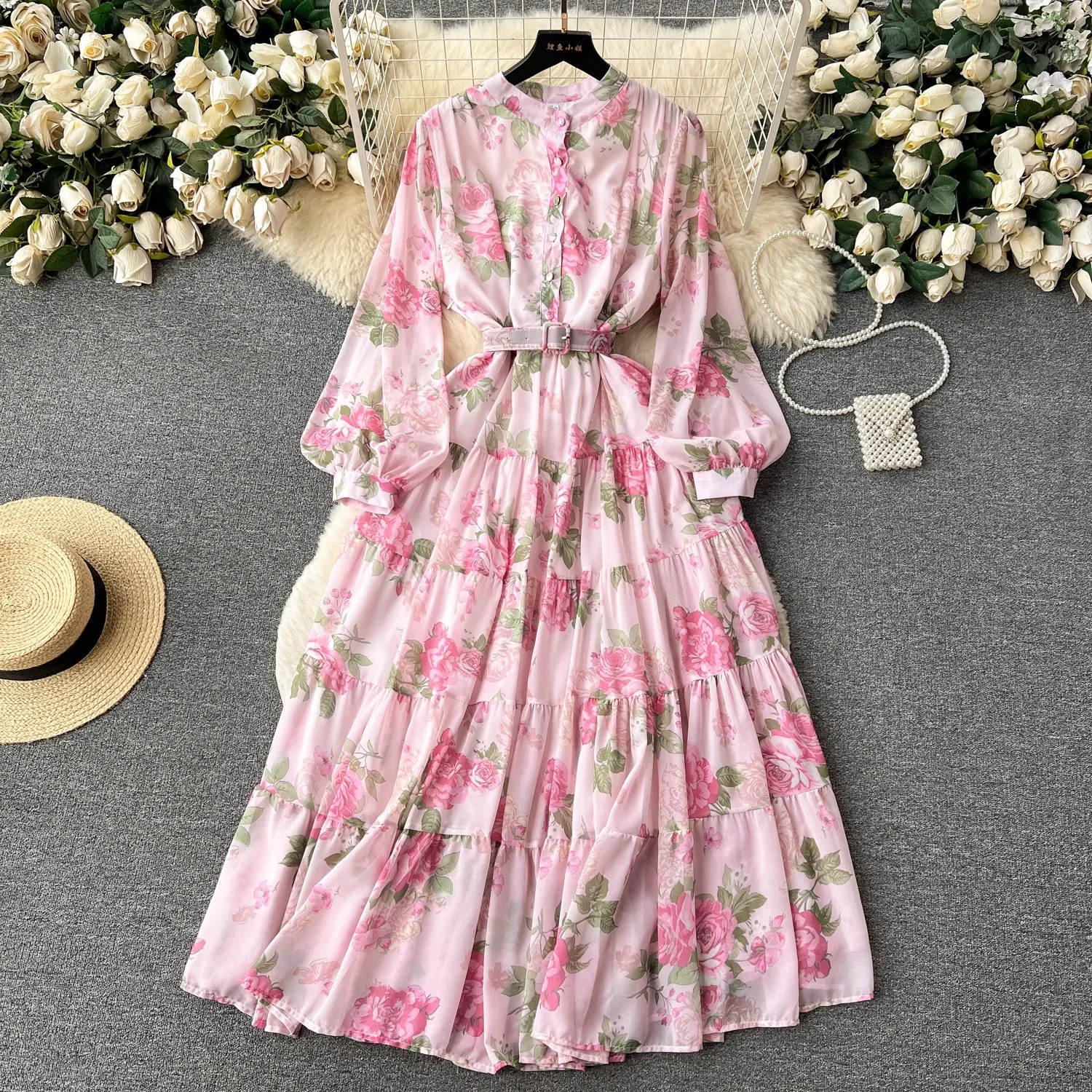 New Arrival Chic Sexy Casual Spring Autumn Breathable Eco-Friendly Sweet Floral Print Maxi Chiffon Women's Elegant Dress