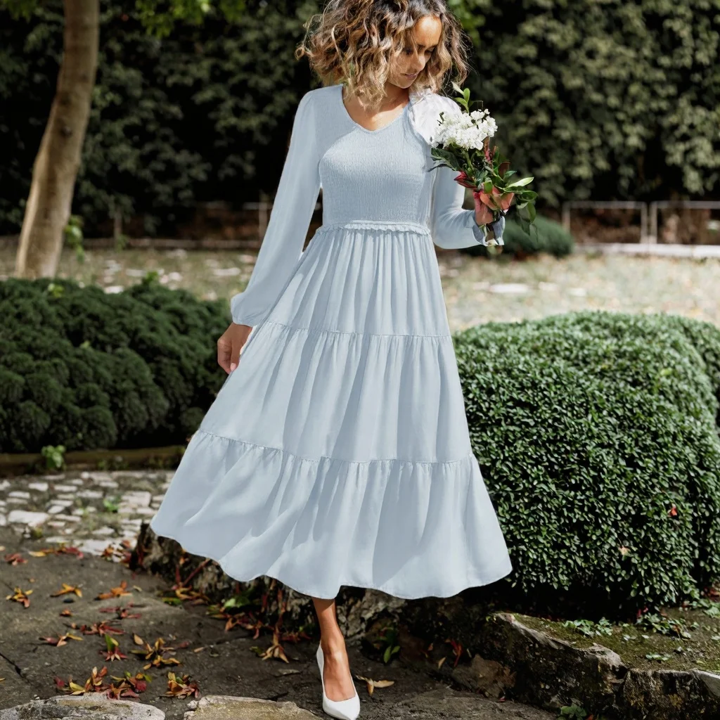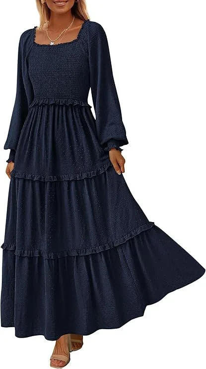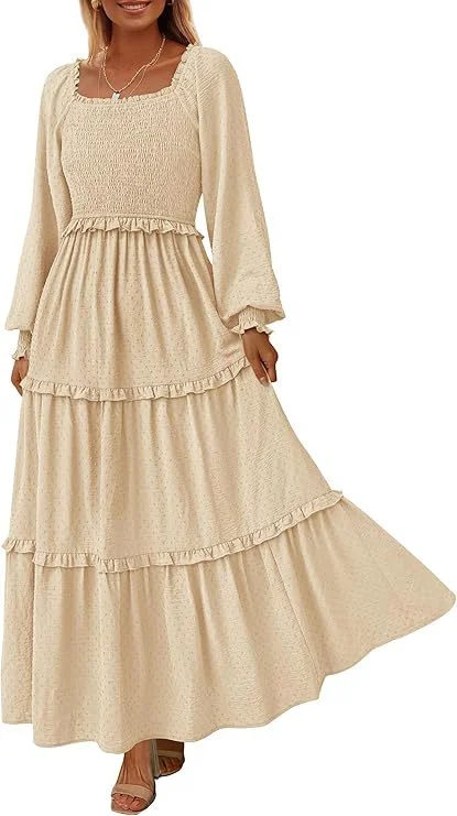 Sexy Summer Casual Long Sleeve Smocked Anti-Static Loose Waist Ruffle Tiered Knee-Length Dress