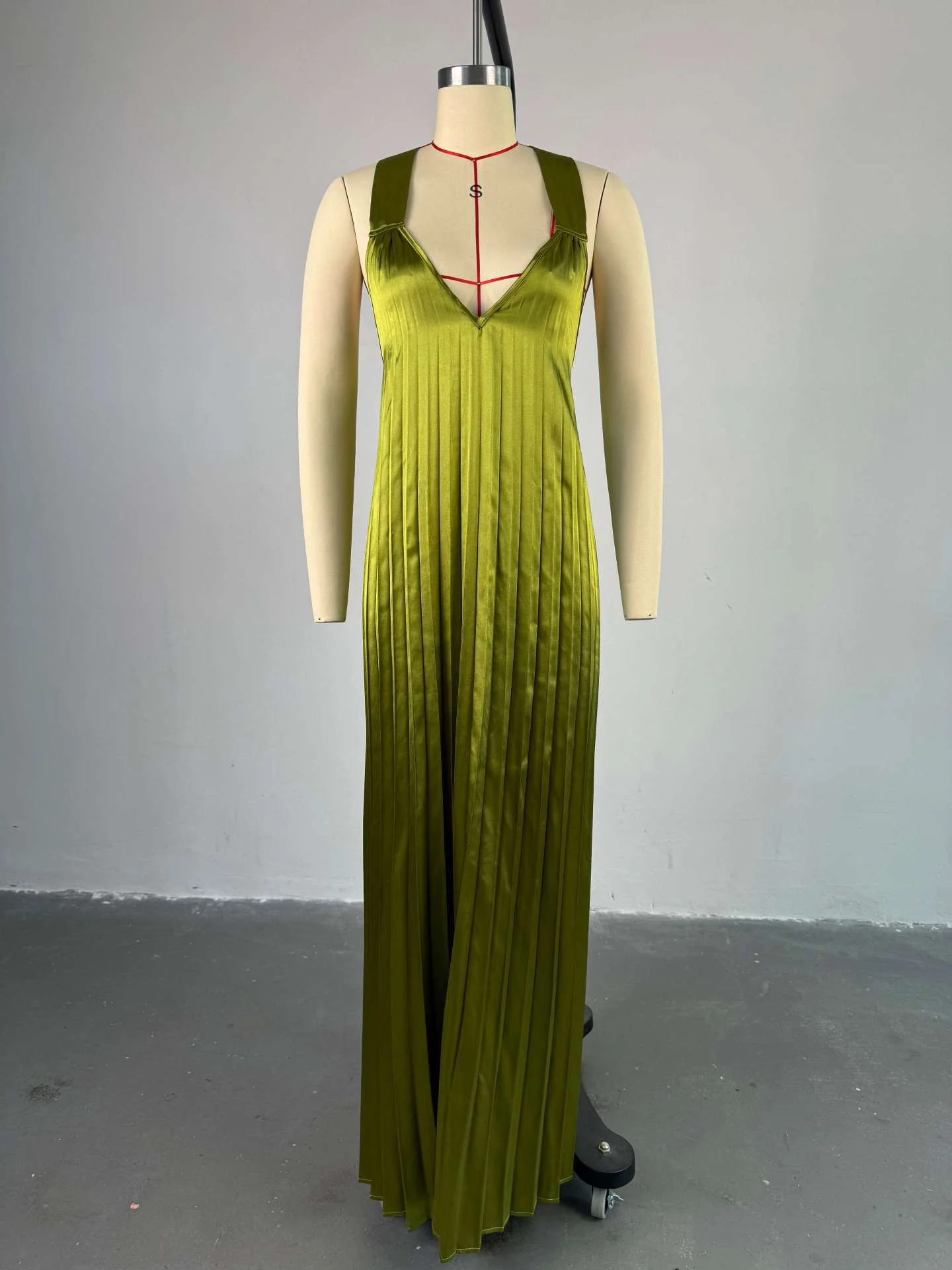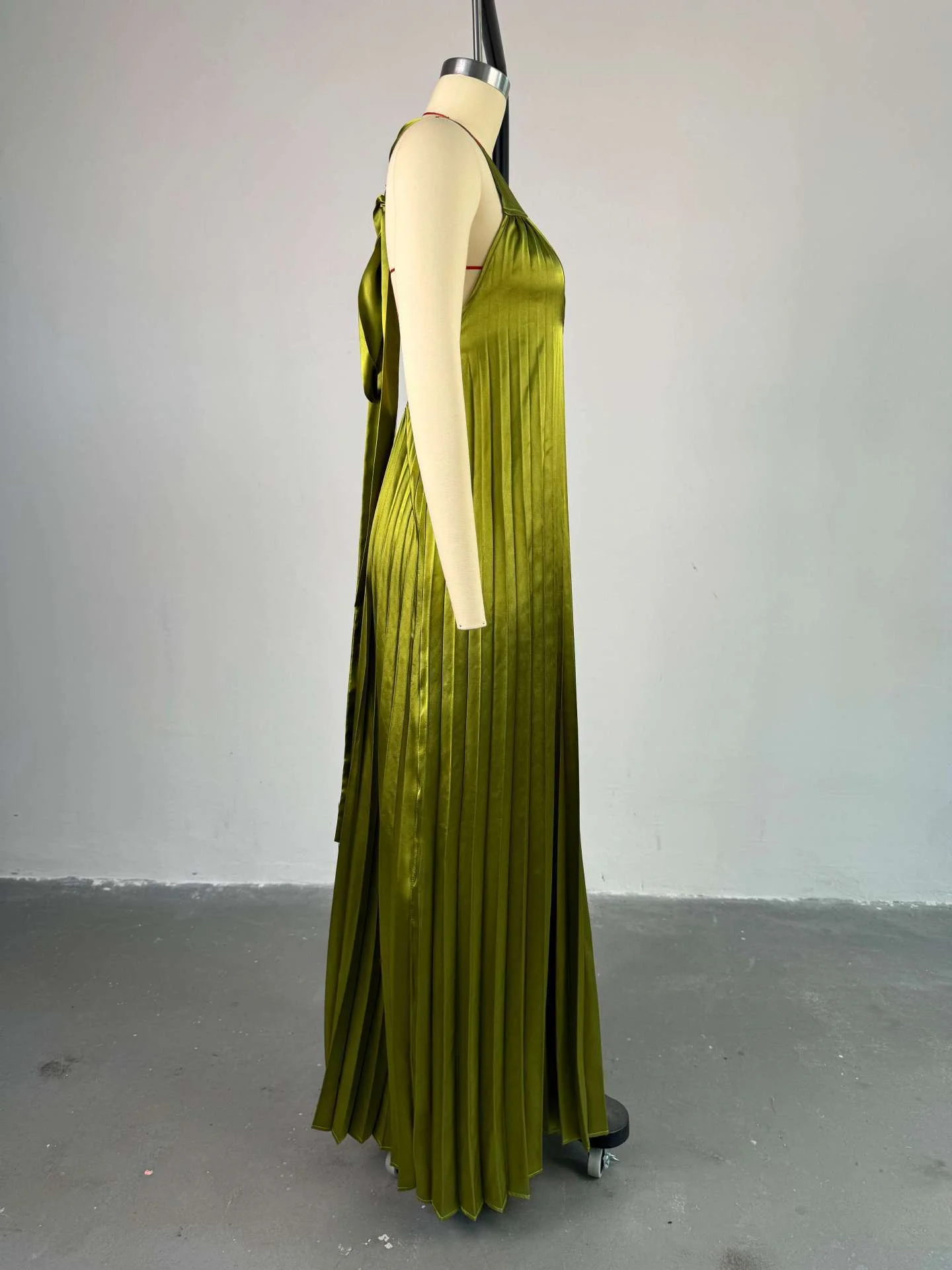 Elegant Women's Pleated Maxi Dress with Halter Strap and Hollow Out Back Solid Color Casual Dress