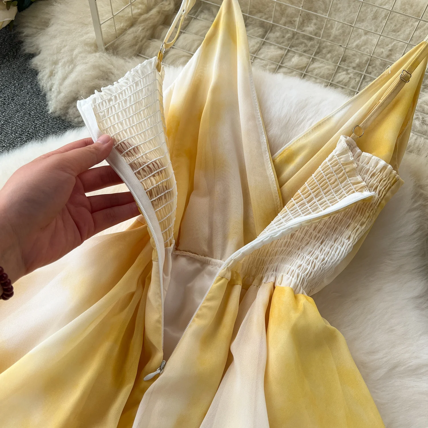 Hot Selling Summer Autumn French Casual Long Yellow Midi Elegant Sleeveless Hanging Dresses