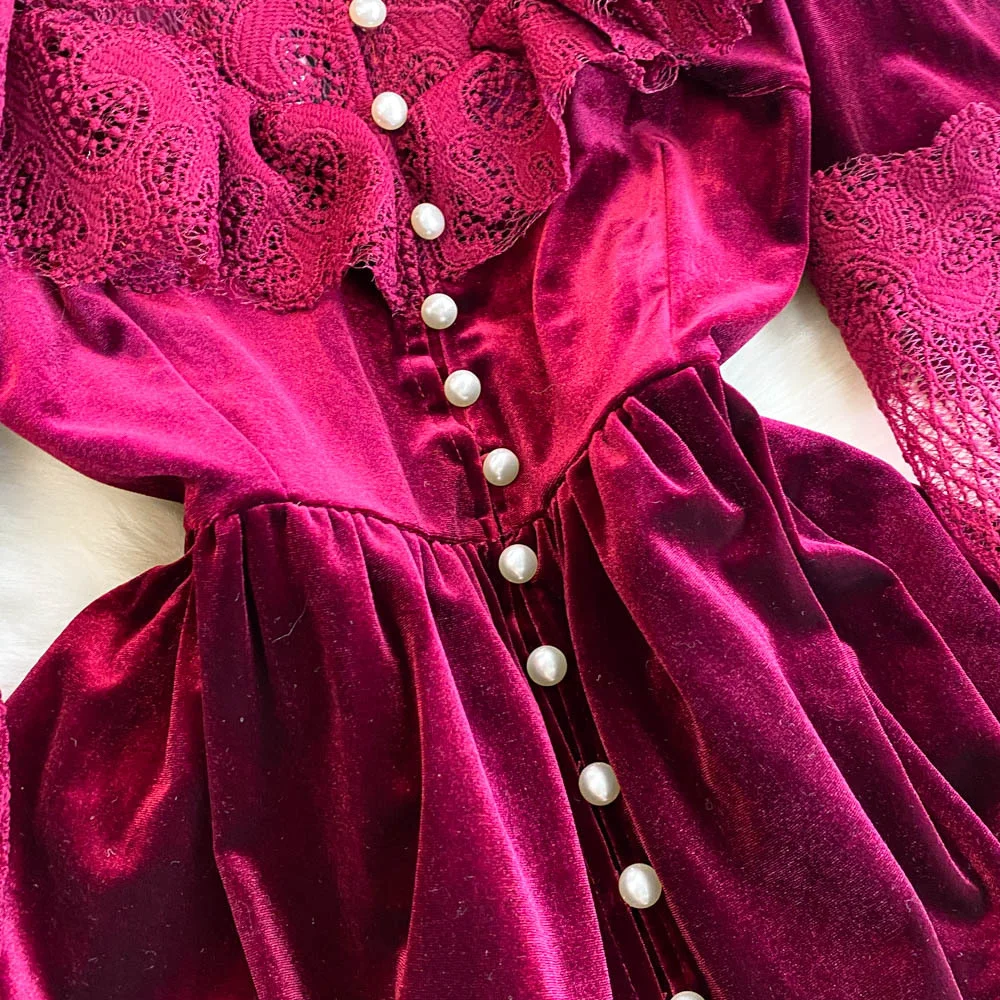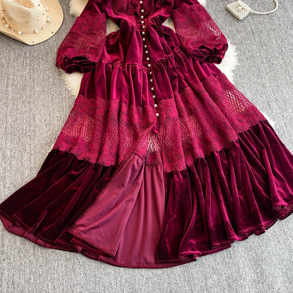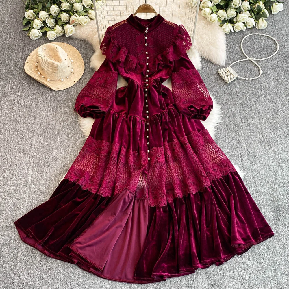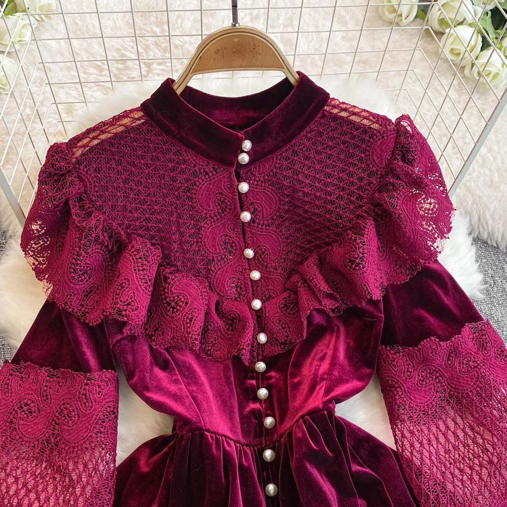 ZYHT 21541 Wholesale Crew Neck High Waist Casual Dresses Elegant Lace Velvet Mermaid Hem Ruched Long Sleeve Dresses for Women
