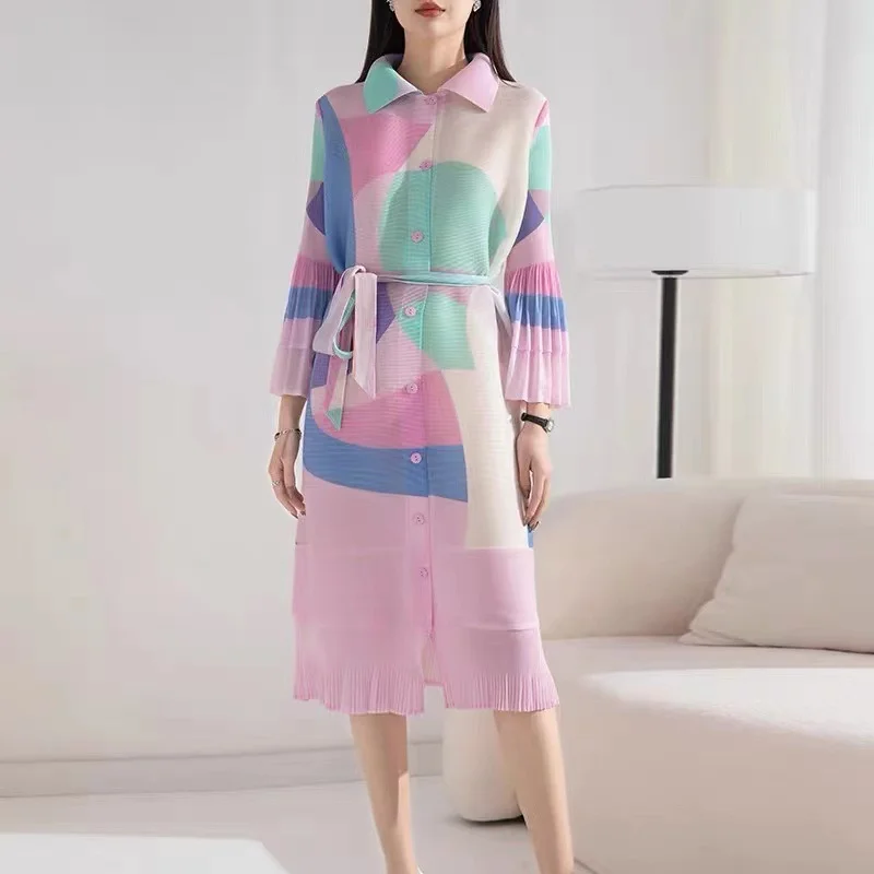 Women's Casual Dress Printed Design Vintage Single Breasted Long Sleeves Wear Split Midi Dresses Spring Autumn