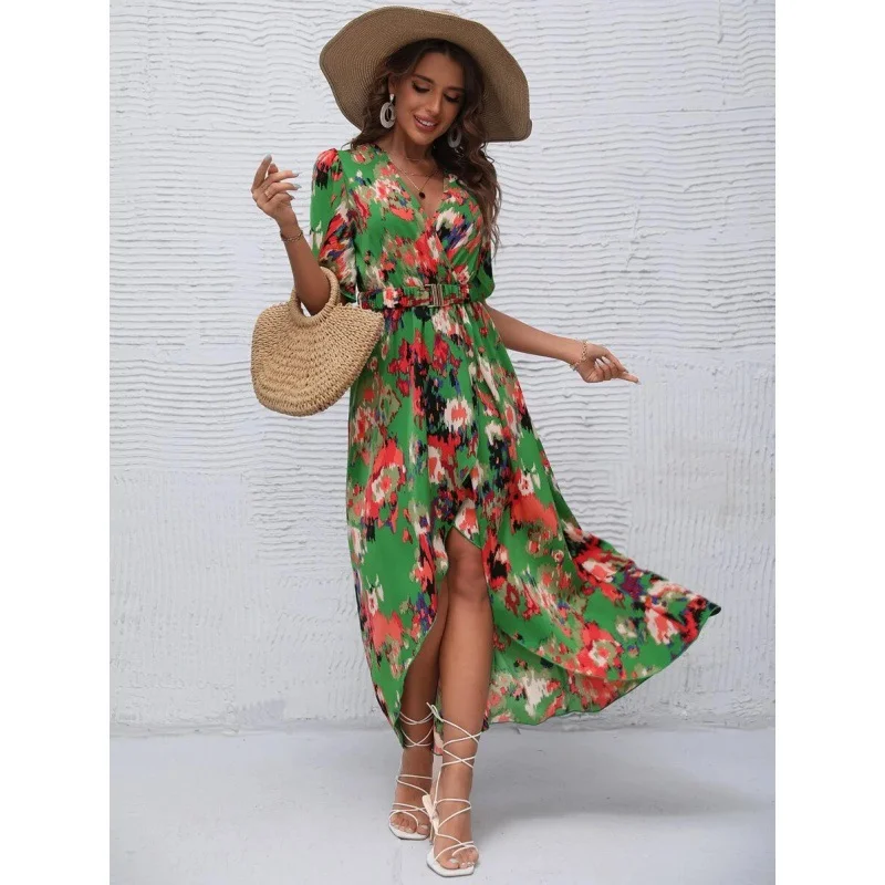 Women Summer Holiday Beach Waist Floral Long V Neck Short Sleeve Dress Fashion Casual Print Belt Slit Party Dress