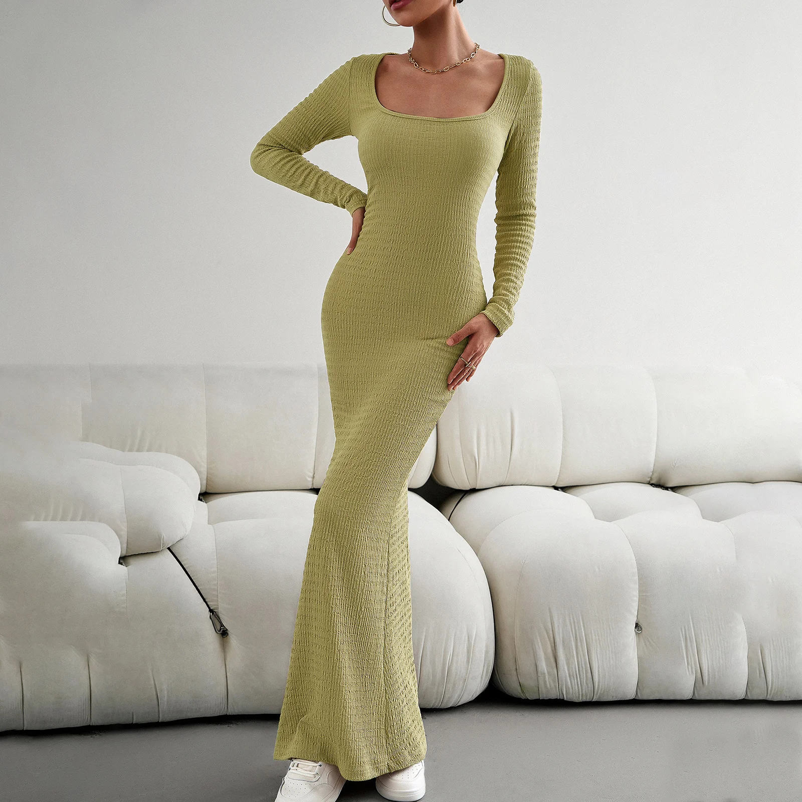 Top Selling Summer Women's Sexy Slim Fit Bandeau Neck Breathable Long Sleeved Knitted Dress Square Neck Knit Dress